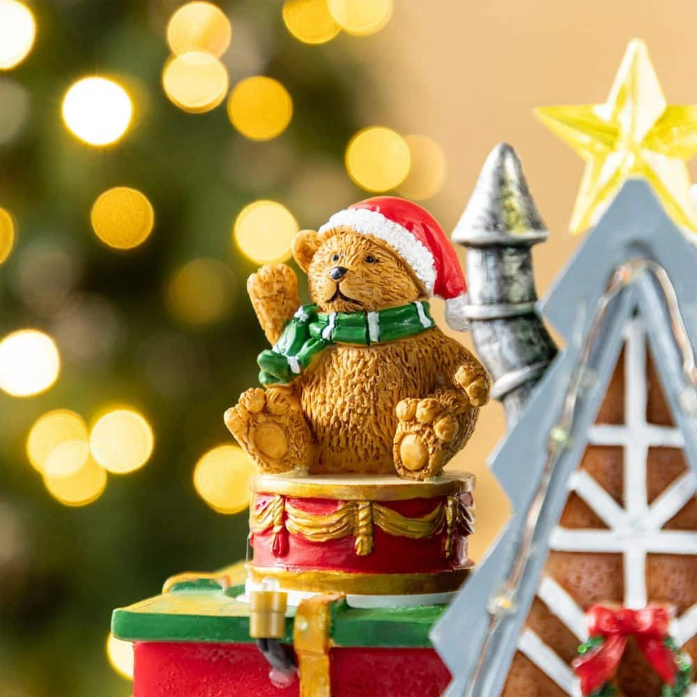 The 10.75 in. H Lighted Christmas Toy Market Resin Village features a charming rotating bear as its whimsical centerpiece, complemented by colorful lights that cast a vibrant glow. With cheerful holiday music enhancing the atmosphere, this animated decoration brings the festive spirit to life in any setting. Handcrafted from durable polyresin, this delightful piece is designed to last and spread seasonal joy for years to come.