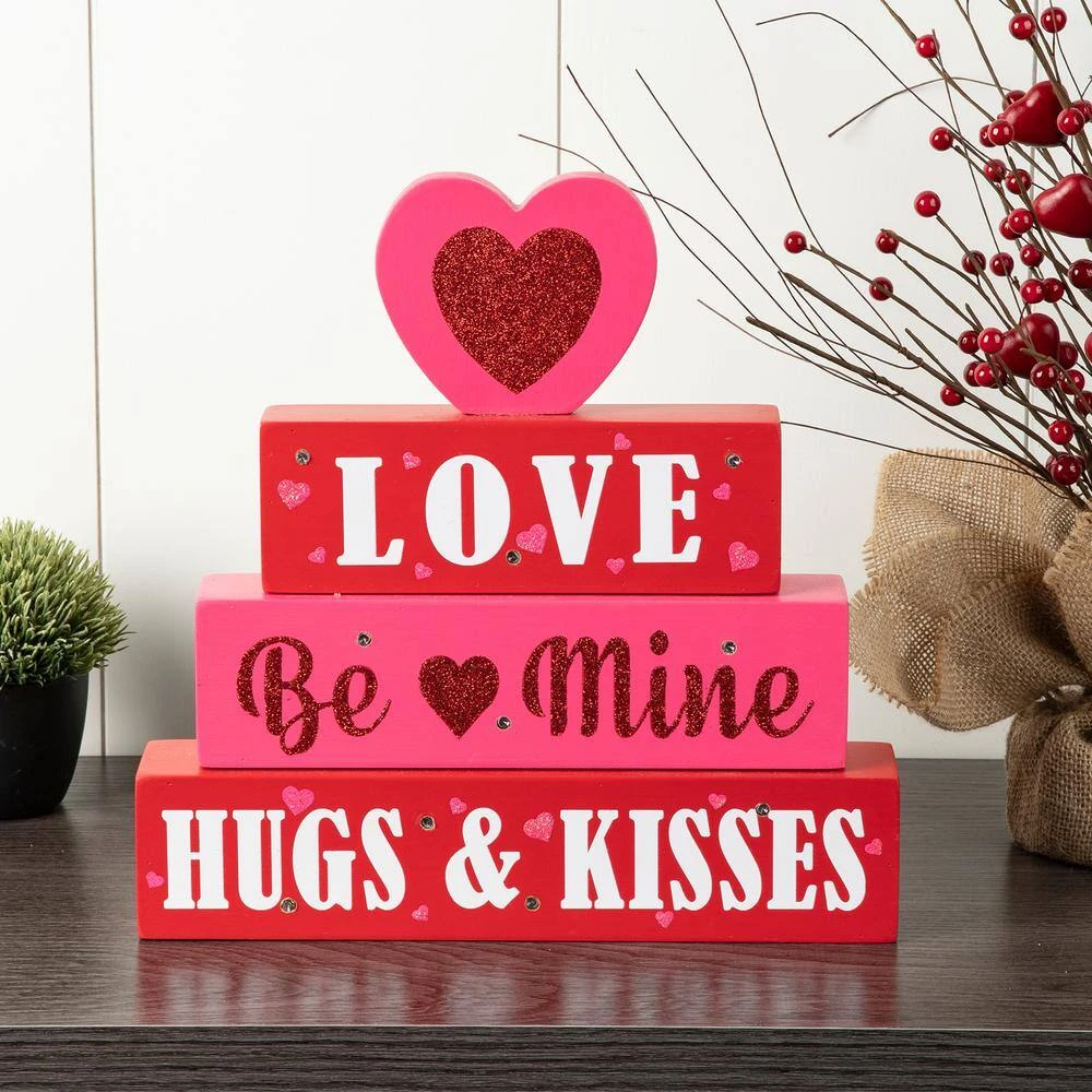 The blocks are skillfully crafted by hand starting with cutting the MDF to size, sanding the raw materials and hand painting the base. It has 10 LED lights on surface, a heart shaped wooden on top and a Valentine’s message of LOVE, Be mine, HUGS and KISSES on a red and pink background, lettering with white and blink red is sure to send a warm for the festive season. The ideal personalized centerpiece, entryway decor or housewarming gift to welcome the holiday season.