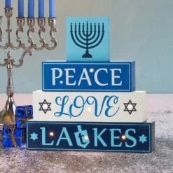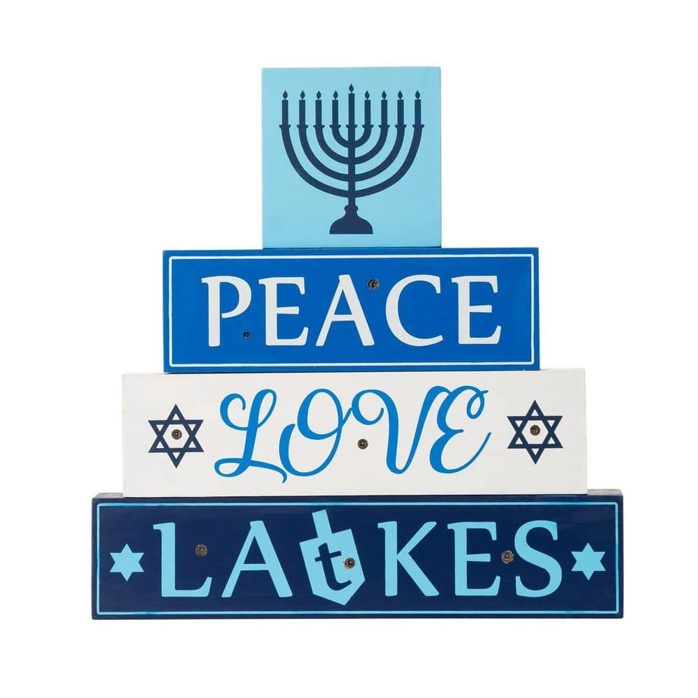 Decorate your home for Hanukkah with this charming wood block sign. In festive colors, it has 8 warm white LED lights on front side. It’s a great addition for your Hanukkah decoration, either on shelf or table.