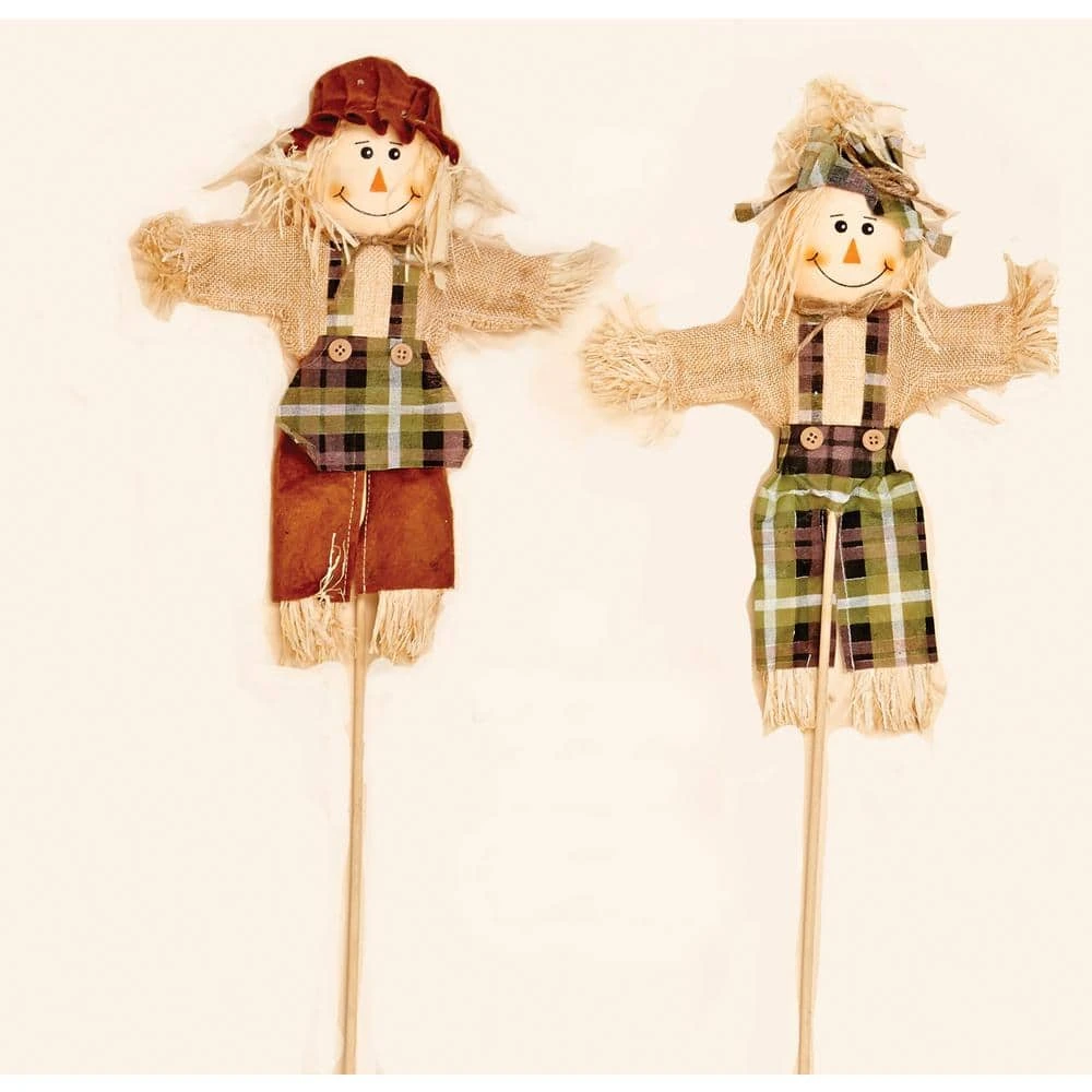 This set of 2 Fall scarecrow picks is made of fabric and straw on a bamboo stick. Its sizes makes it perfect for a pot or a planter. Great accent for any Fall decoration.