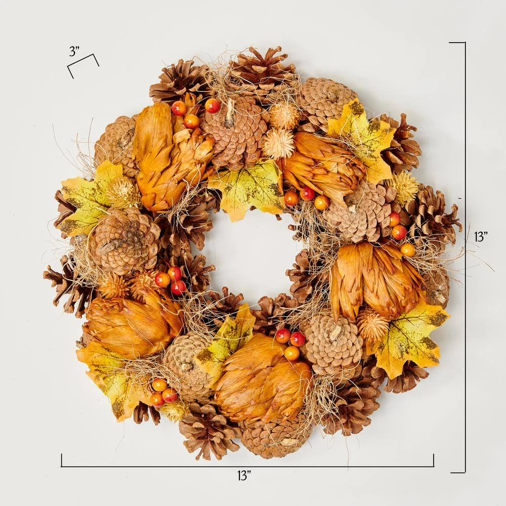 Welcome guests to your home the right way during Fall with this unique wreath. Detailed with artichokes, pine cones and realistic berries. Place it on a door or wall for that great Fall feeling.