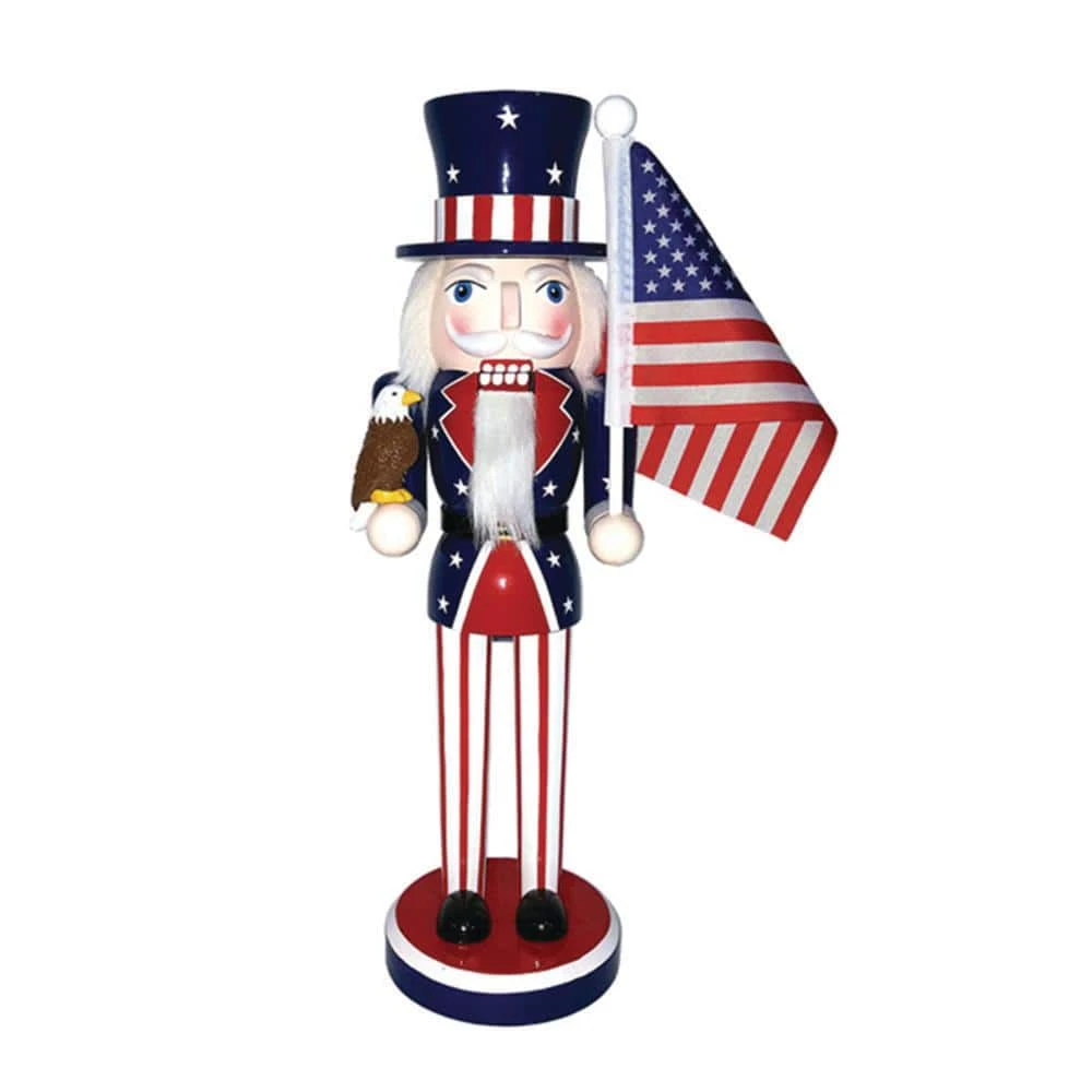 This 14 in. nutcracker is the ultimate Patriot. His jacket is painted blue with white stars and red lapels. His pants are red and white. He is holding the American flag in 1 hand and on his arm sits an Eagle. To complete his look his hat is blue with white stars and red and white stripes. This piece stands on a red, white and blue round base.
