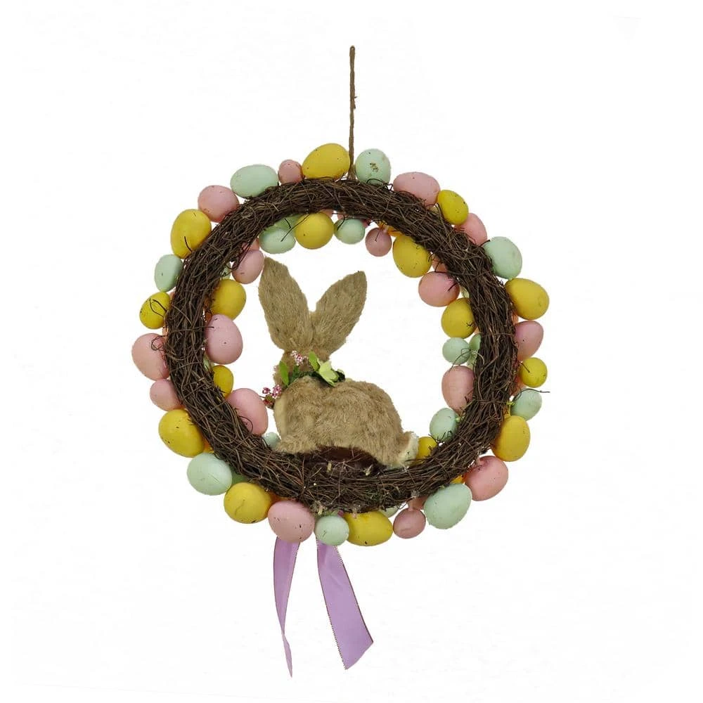 - ARTIFICIAL EASTER WREATH: An expertly crafted faux Easter wreath featuring pastel eggs, a decorative ribbon, and a cute bunny, creating a whimsical and welcoming ambiance. This wreath is designed with a sturdy woven branch base, ensuring durability and a secure structure.