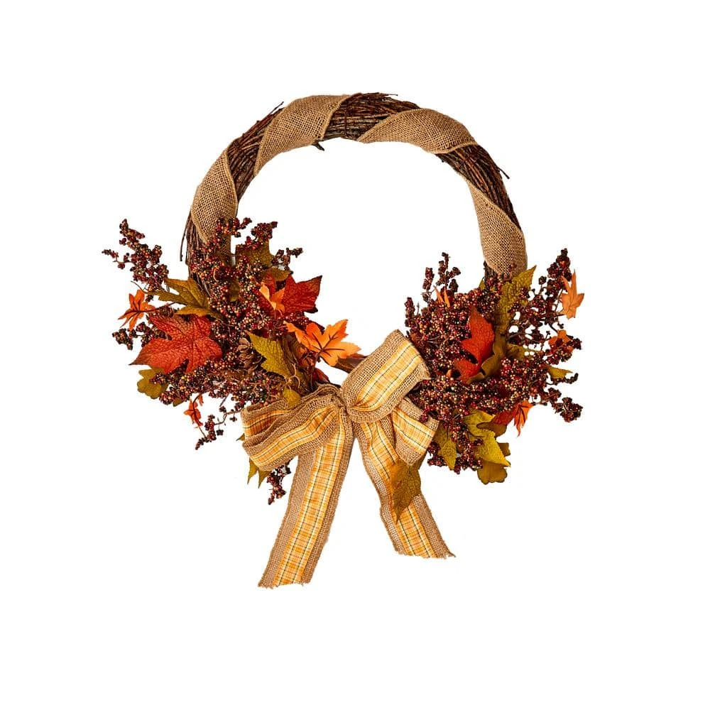 This pretty wreath is the perfect addition to your fall decor. It is set upon a twig based wreath that is partially covered with leaves, berries and pinecones. It is also wrapped with burlap ribbon that is tied into a beautiful bow.