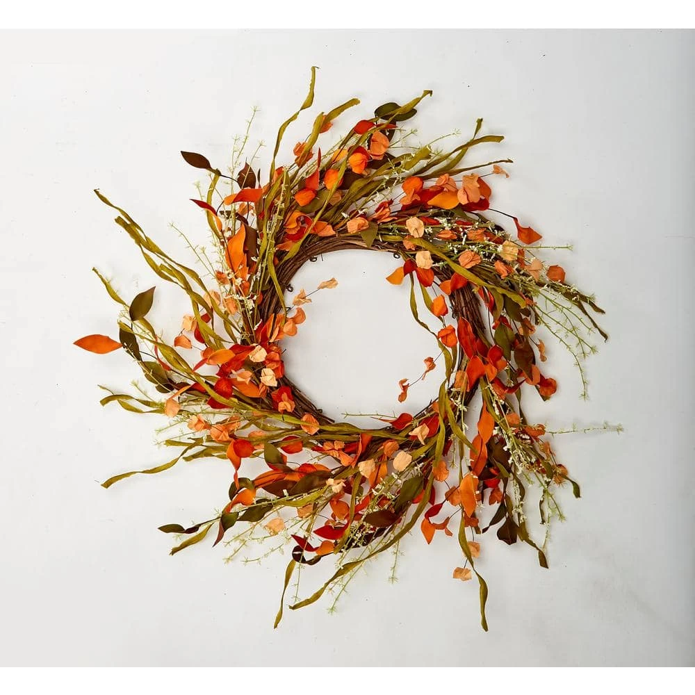 This wreath is the perfect addition of you fall decorations. The wreath features orange leaves, green grasses and soft white blooms. It is arranged in a swirling pattern on a twig based wreath.
