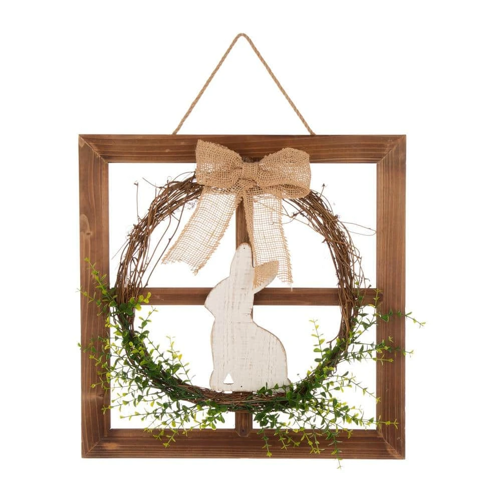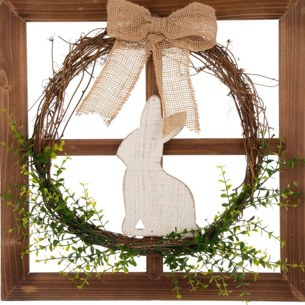 Bring country cottage charm to your space with this architectural wall decor. Handcrafted from wood, this design strikes a square window-shaped silhouette in a natural wooden finish. Featuring natural rattan with green leaf and a wooden bunny stood, with a bow on top, presenting a lovely and vivid picture, conveying the full thriving breath of spring. Decorating your home with this wall decor will lend a cheerful festival touch.