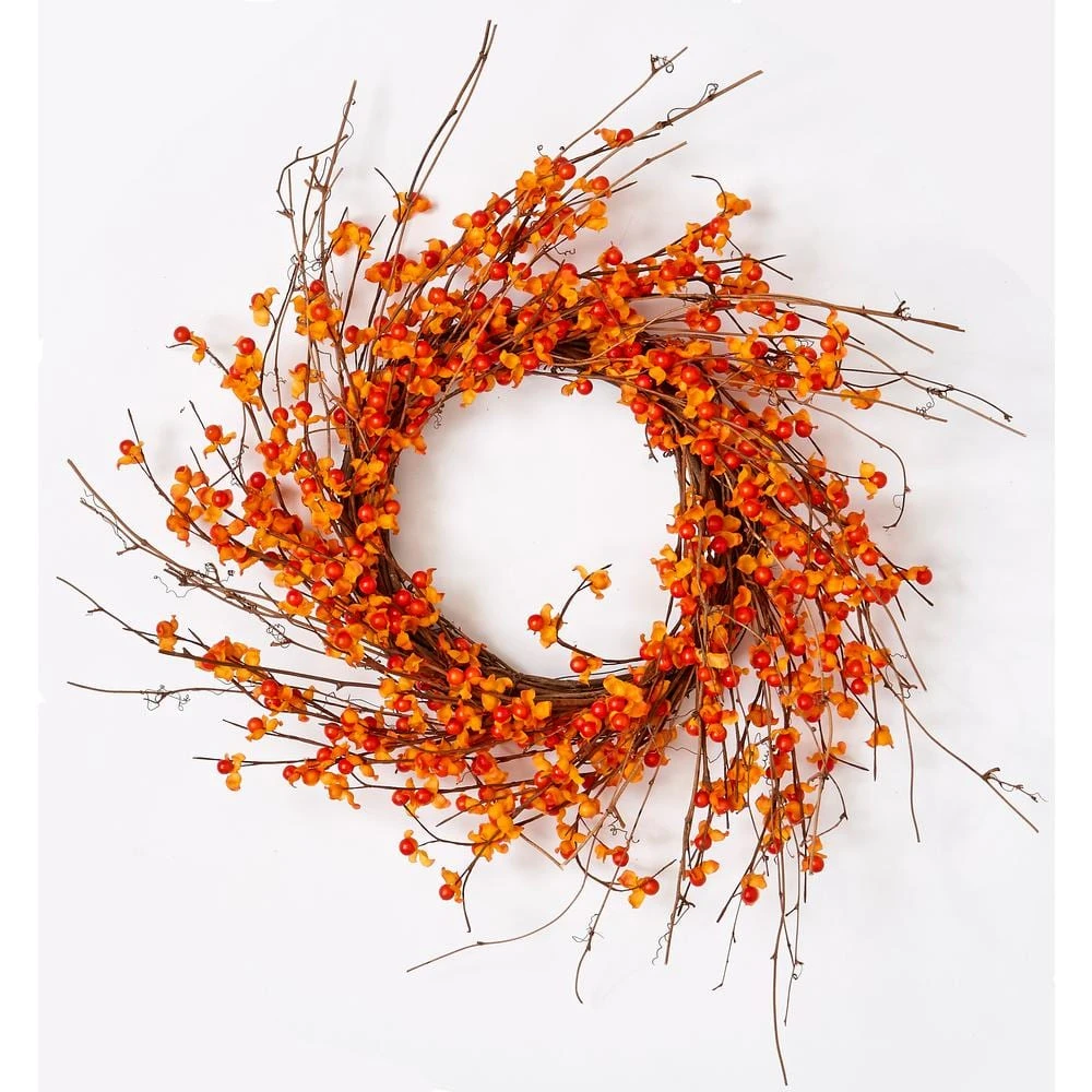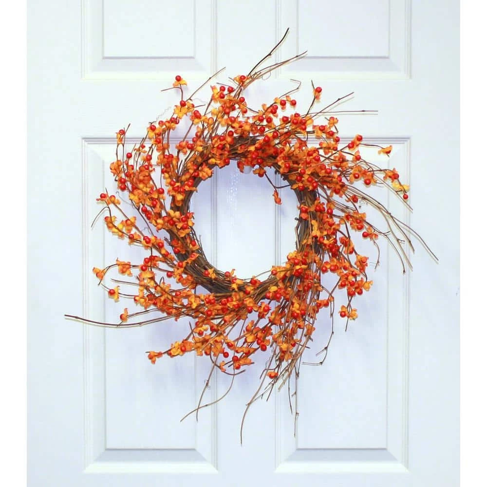 Capture the feeling of a crisp fall day with this beautiful autumn wreath. It features pumpkins and berries accented with pinecones and green foliage. This wreath will give a pop of color to your home decor. Display this vibrant wreath on doors walls windows or over your mantle. Product Features: Artificial pumpkin and berries wreath. Features white gold and green pumpkins white berries pinecones and green foliage. Artificial brown twig backing for hanging. No assembly required – wreath comes in 1-piece. Recommended for indoor use – if using outdoors place under a covered area. Dimensions: 20 in. Dia (measured from outermost edge to outermost edge across the wreath). Inner ring dimensions: 9.5 in. Material(s): plastic/foam.