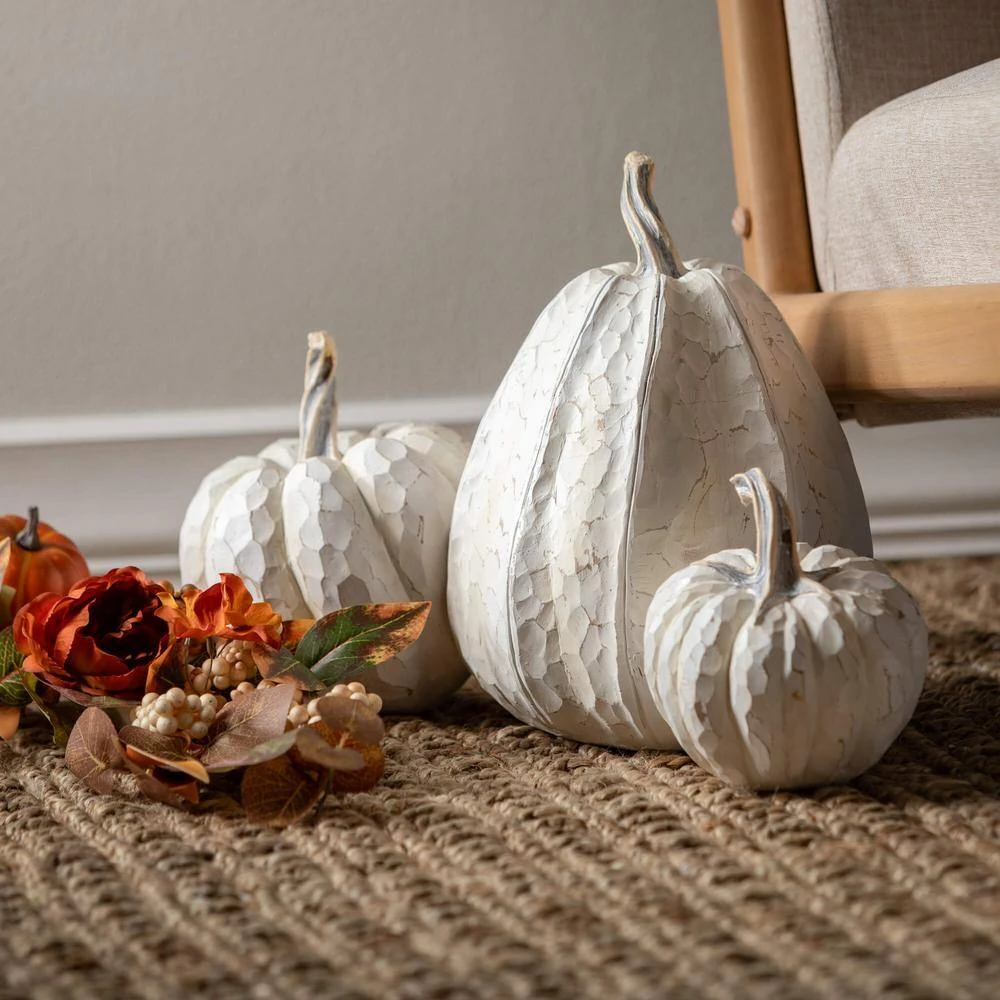 - Elegant rustic charm: elevate your seasonal decor with this set of rustic white pumpkins decor, crafted from high-quality resin to resemble charming white pumpkins with a rustic finish, adding an elegant touch to your autumn displays