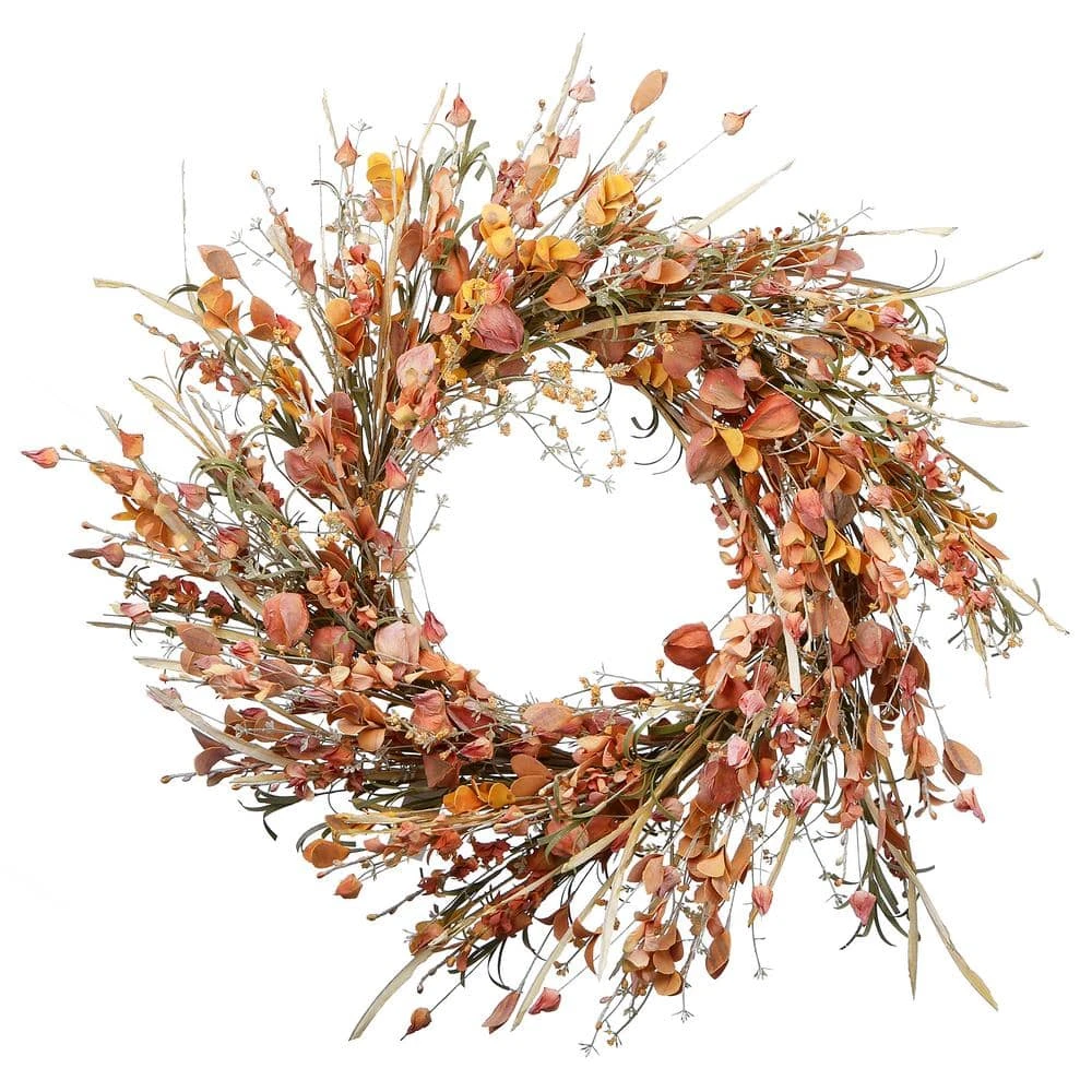 This wreath features a swirl of assorted long-stemmed wild flowers flowing from a woven branch base. Mixed in are leafy stalks and twigs creating additional color and natural appeal. Hang this fall-flavored rustic wreath on doors, walls and windows in indoor or covered outdoor locations.