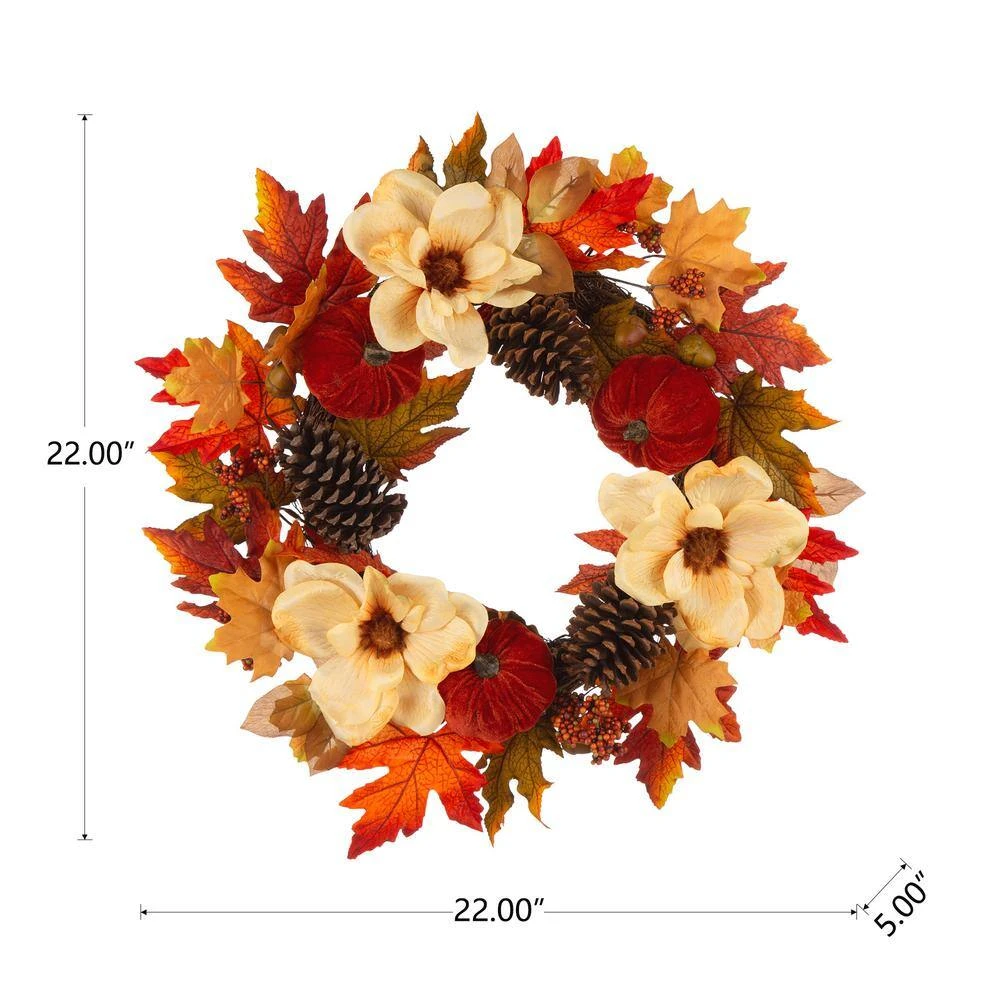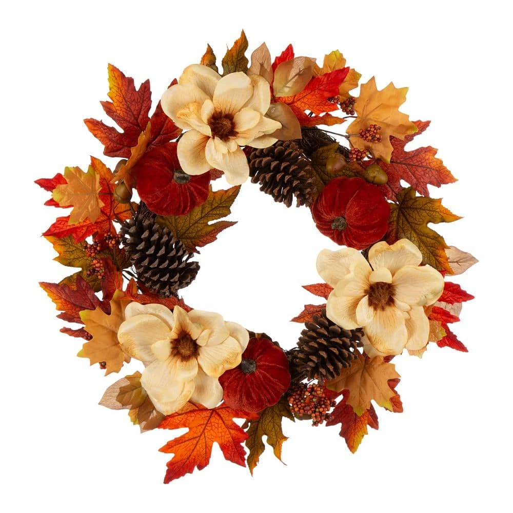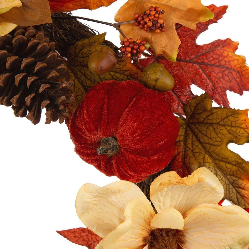 - Decoration of velvet pumpkin/magnolia flower/pinecone and berry