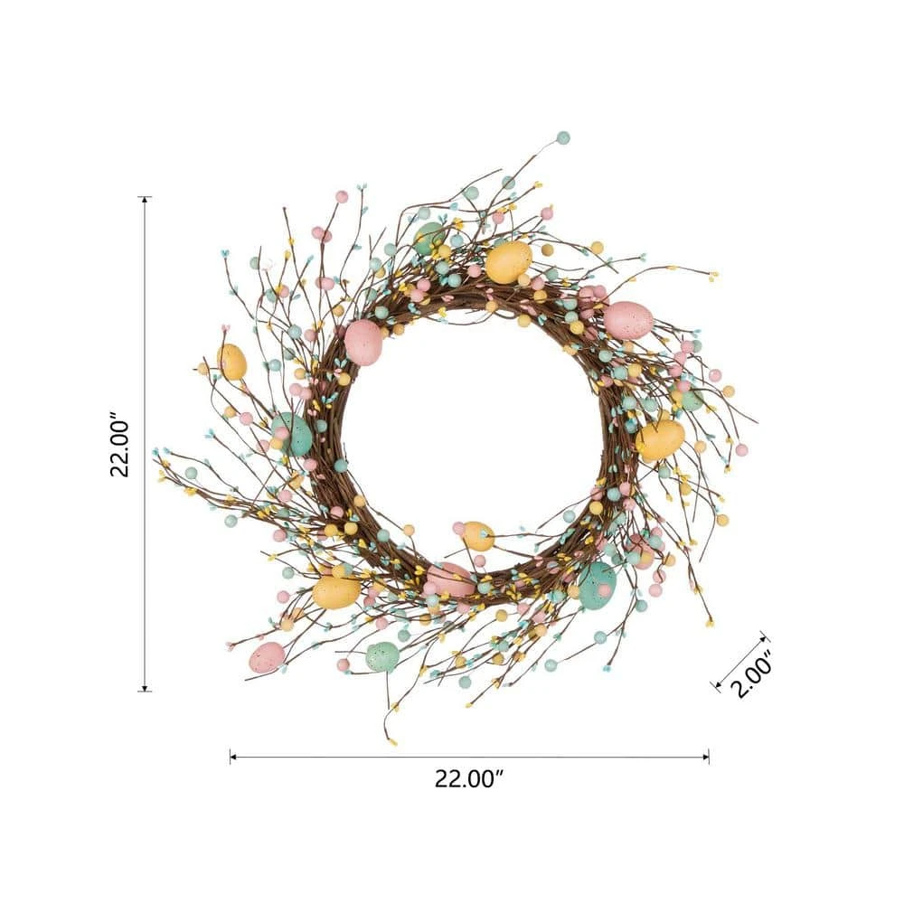 The Easter Egg Wreath is part of the garden accents line of home decorating ideas. This wreath is featured with swirling stems and vines and colorful assorted flowers. The pastel shades and stippled eggs create an attractive holiday trimming. Welcome Easter and the spring season with this bright and cheery decoration. Display on doors, walls and windows indoor or covered outdoor locations.