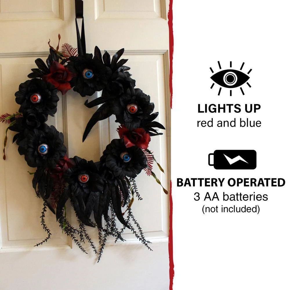 - Trick or treat: your new wreath trimmed with black and red roses, creepy eyeballs and black vine accents will complete your haunted house look, helping you welcome the spooky season, your trick-or-treaters will love it