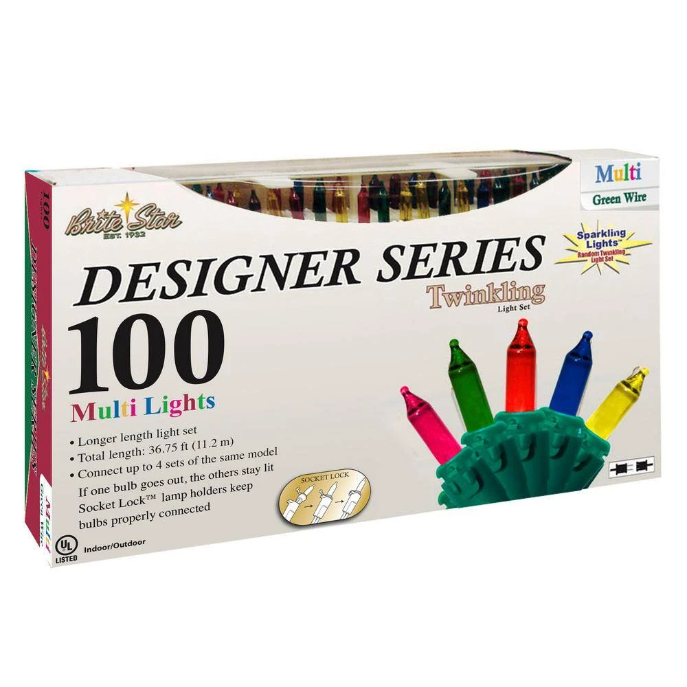 This set of 2 twinkling light set are multi colored and shines with 100 bright bulbs. The twinkling adds a distinct feel to these lights. Each strand is 24.52 ft. long, comes with an 18 in. end cord, 2.75 in. spacing between bulbs and a 4 in. end cord.