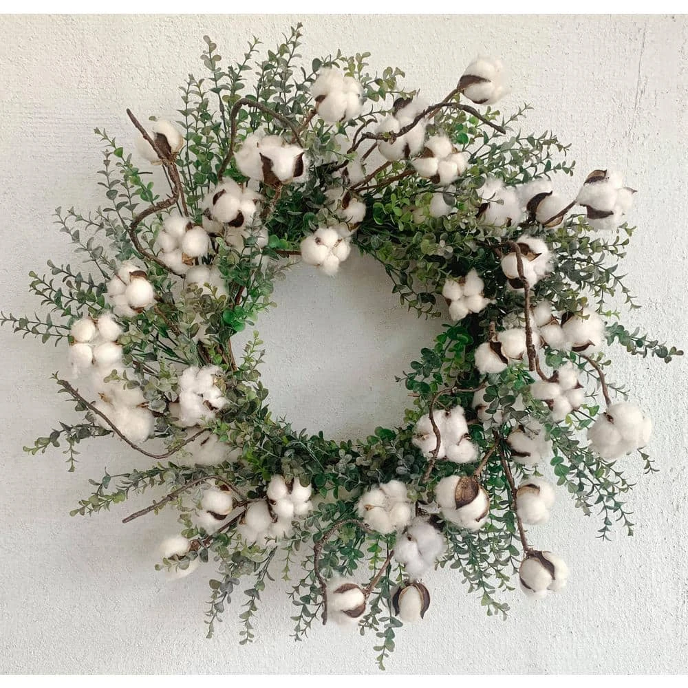 Durable and nearly natural Cotton ball, versatile mini eucalyptus leaves, set on a natural, thick grapevine wreath base. It’s natural,Stable and beautiful.It will make your entryway more vibrant and attractive.