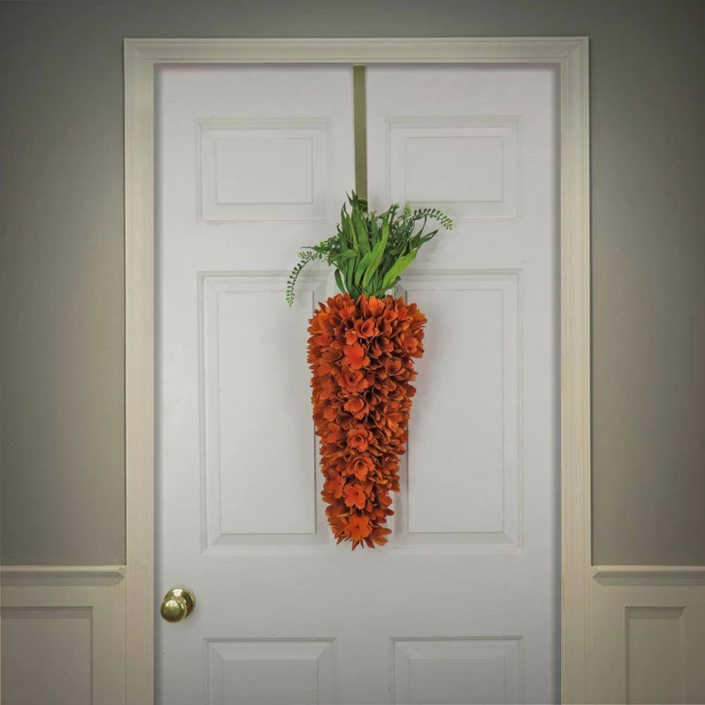 This Easter decoration features tightly grouped orange curls and cuts of wood designed to simulate petite flower blooms and petals all styled in the shape of a carrot. From the top rises a crown of thick leafy greens for added natural appeal. Hang this unique Easter holiday trimming on door, wall or window in indoor locations. Hanging loop included.