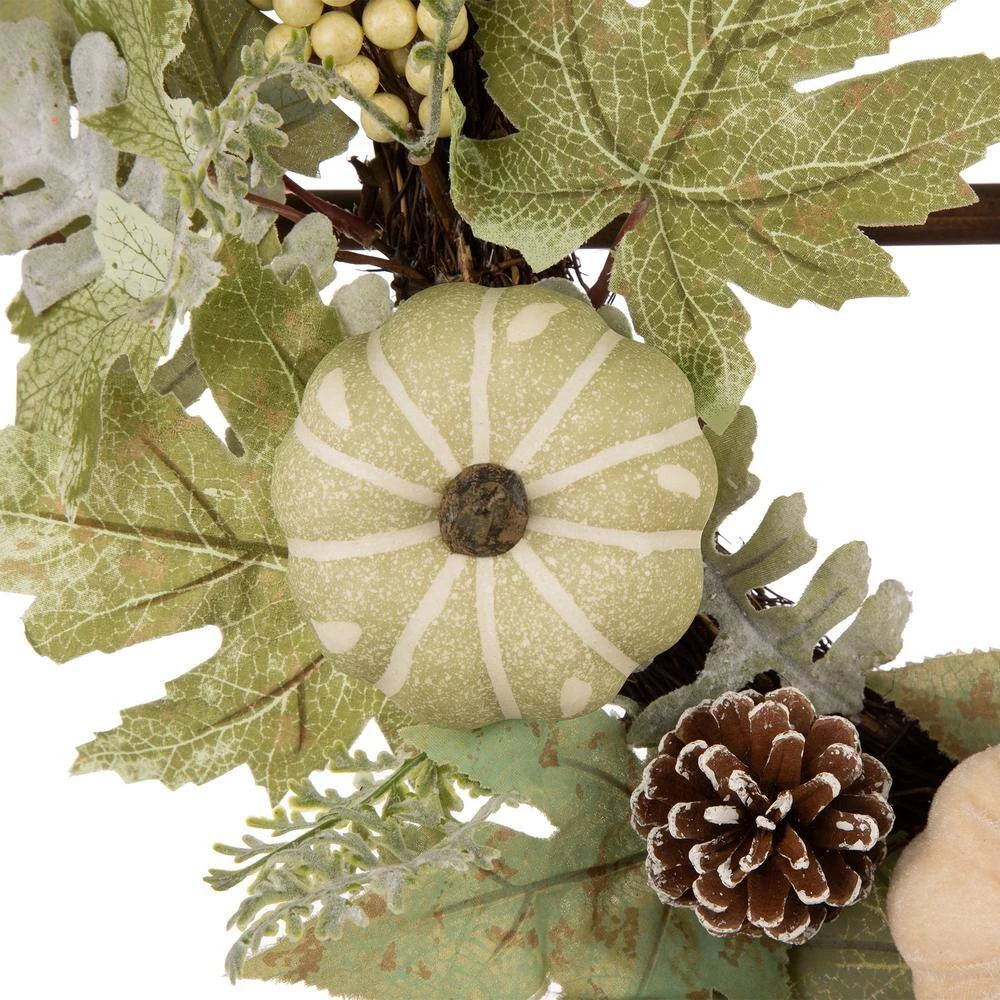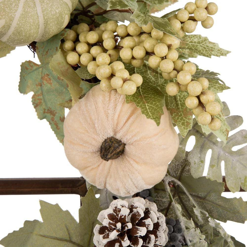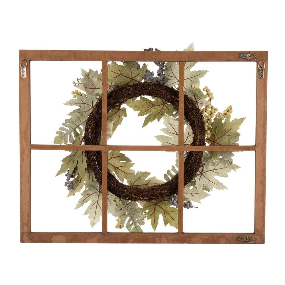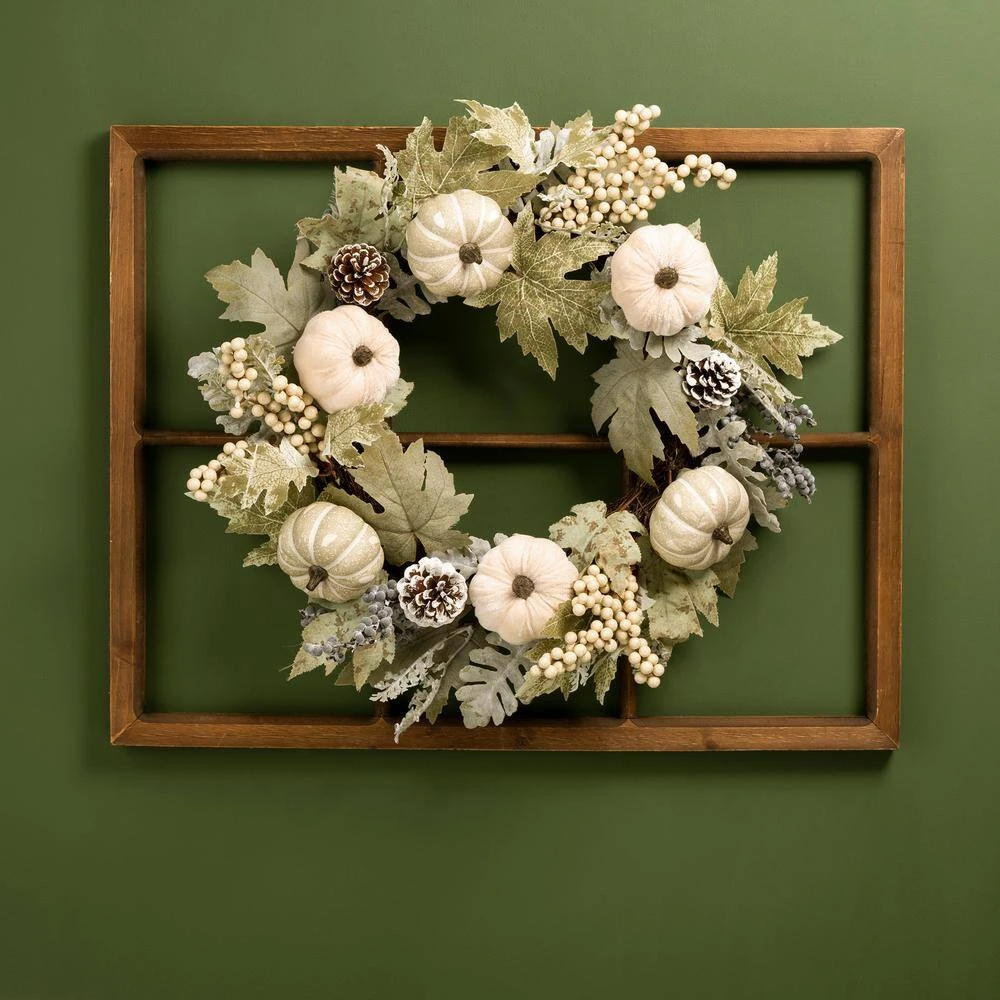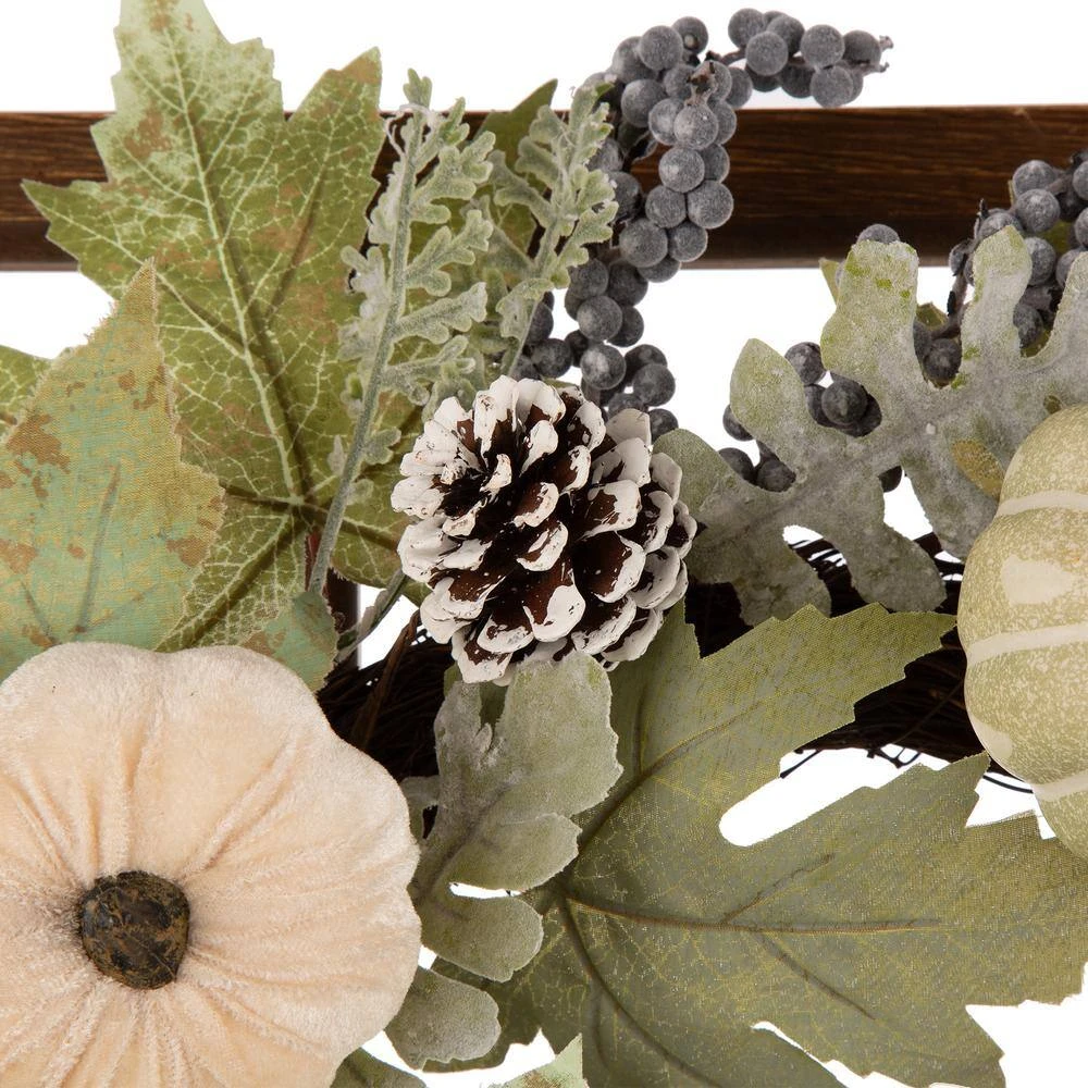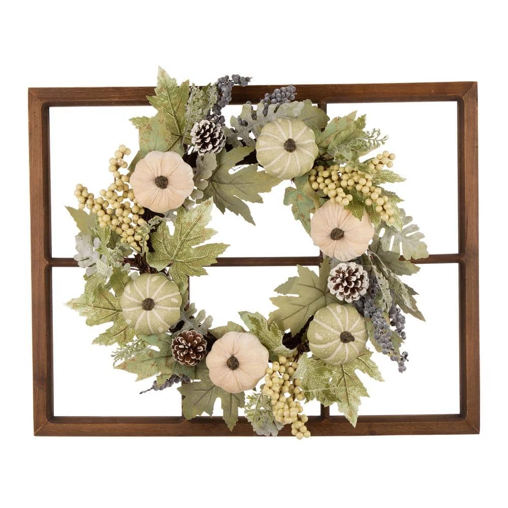 Give your decor a farmhouse touch with this artificial Fall pumpkin wreath on the wooden Window frame. This gorgeous wreath is created with an eye catching combination of Fall elements, decoration with leaves, pinecone, blueberry and pumpkin, ideal for your all Fall season. The display on walls is simple and basic and the wreath is can be removed.