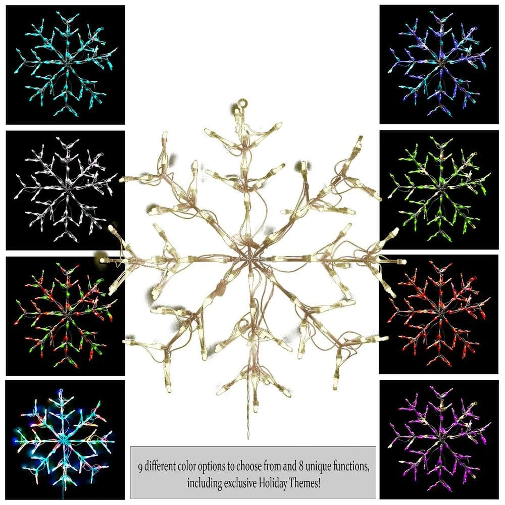 This dynamic 28 in. RGBWW LED Color Changing Snowflake Christmas Decoration will bring interactive fun for the family to your Holiday Decorating. Use a simple remote to choose between 9 different colors and 8 different functions to create the ultimate statement piece. With 96 commercial grade 5 mm LED bulbs, this brilliant 28 in. H and 28 in. W Snowflake metal framed display will light up your yard for many Holiday Seasons to come. The white commercial powder coated steel frame is durable, making it weather proofed for outdoor decorating. The LED bulbs will lighten up any celebration, either indoor or outdoor. This metal-framed light can be secured to your house or any wall with minimal installation. For ease and convenience, it can also be staked in the yard. Yard Stake and mounting hardware not included.