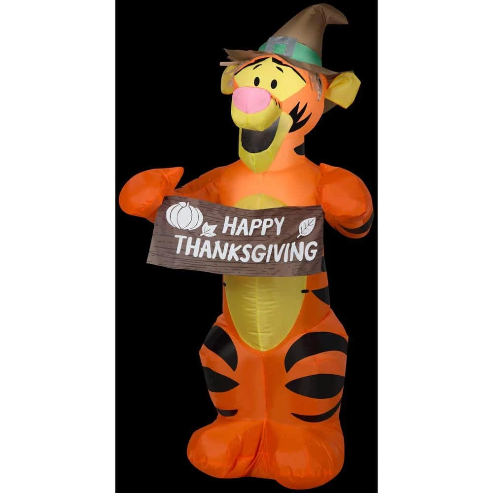 Decorate your yard with the familiar face of this Airblown inflatable character. Tigger stands with a Happy Thanksgiving banner in this cute scene. It comes with everything needed for easy outdoor setup. Just plug it in, stake it down and watch the magic unfold. Display this delightful outdoor decoration as a standalone or combine it with other Airblown Inflatables to create a custom scene. It’s also perfect as an indoor Halloween decoration for parties and celebrations.