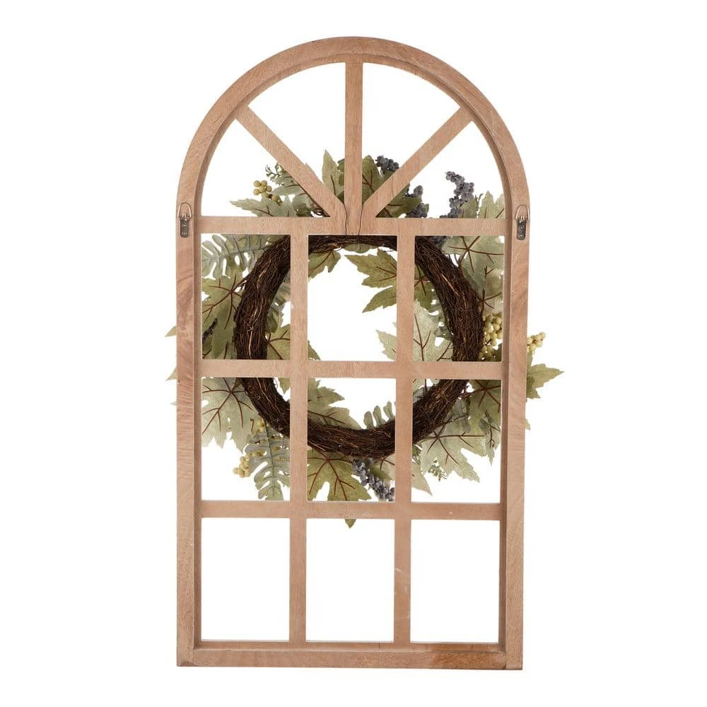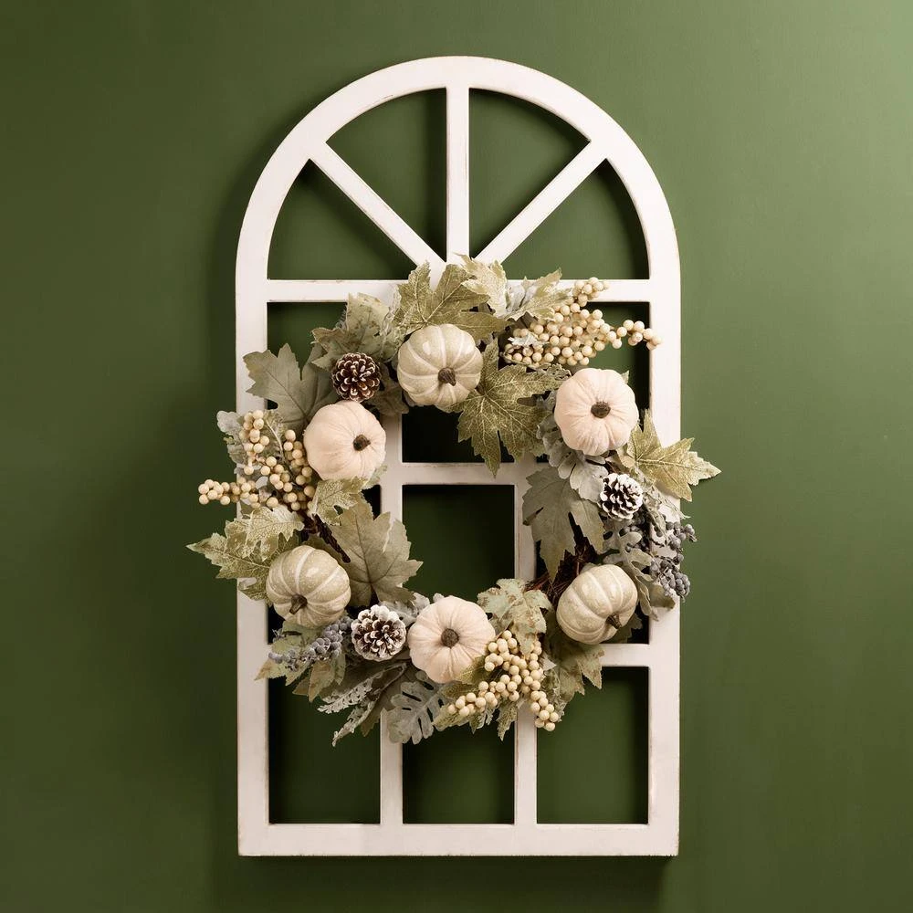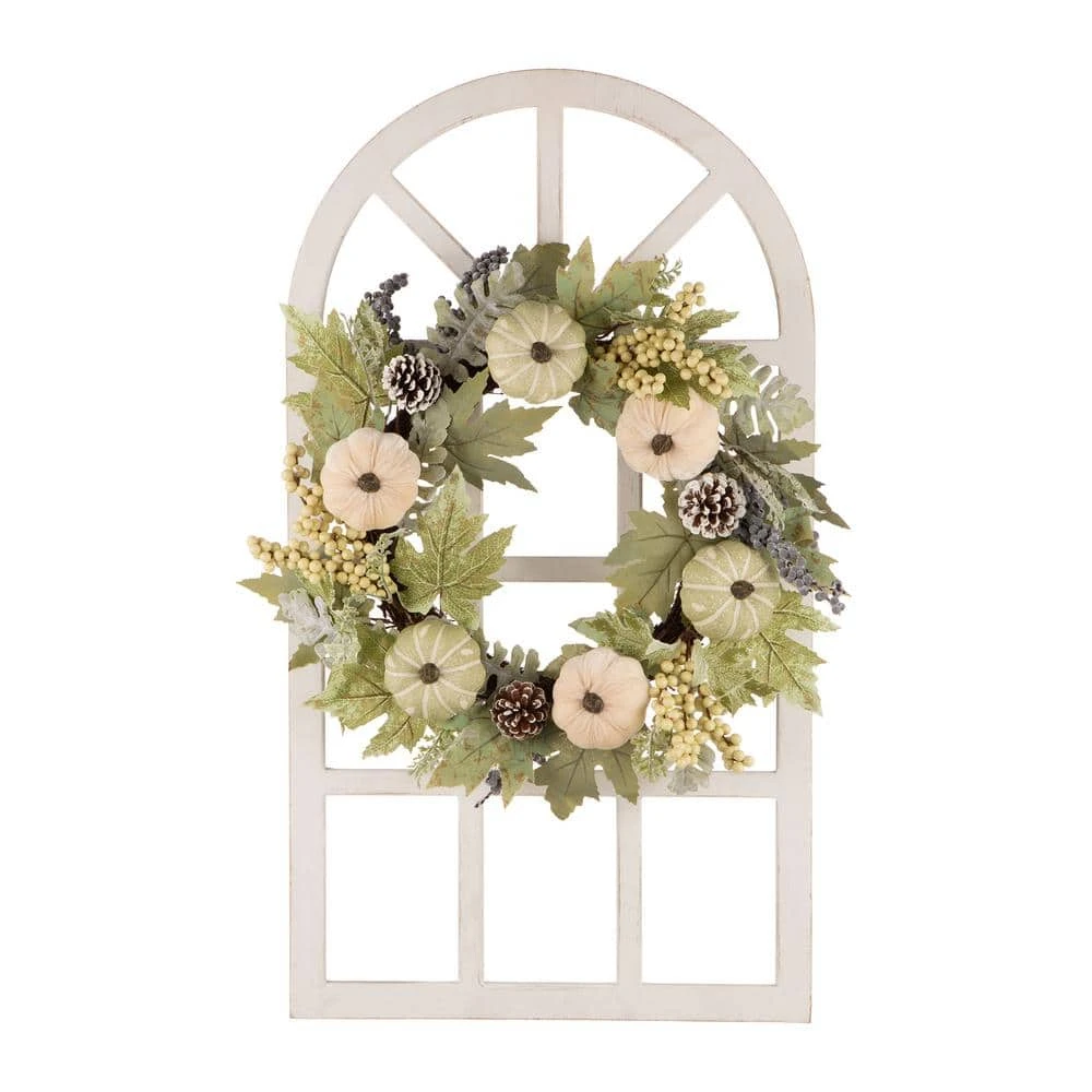 Give your decor a farmhouse touch with this artificial Fall pumpkin wreath on the wooden Window frame. This gorgeous wreath is created with an eye catching combination of Fall elements, decoration with leaves, pinecone, blueberry and pumpkin, ideal for your all Fall season. The display on walls is simple and basic and the wreath is can be removed.