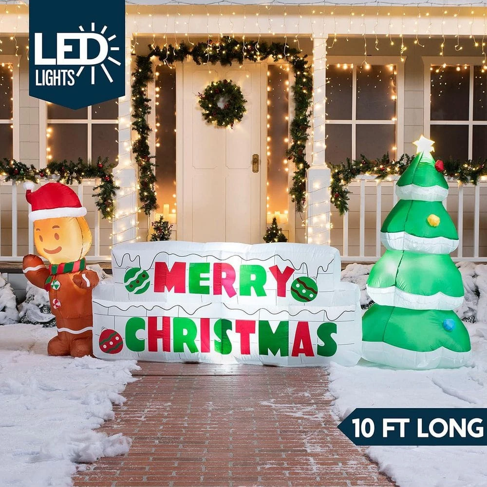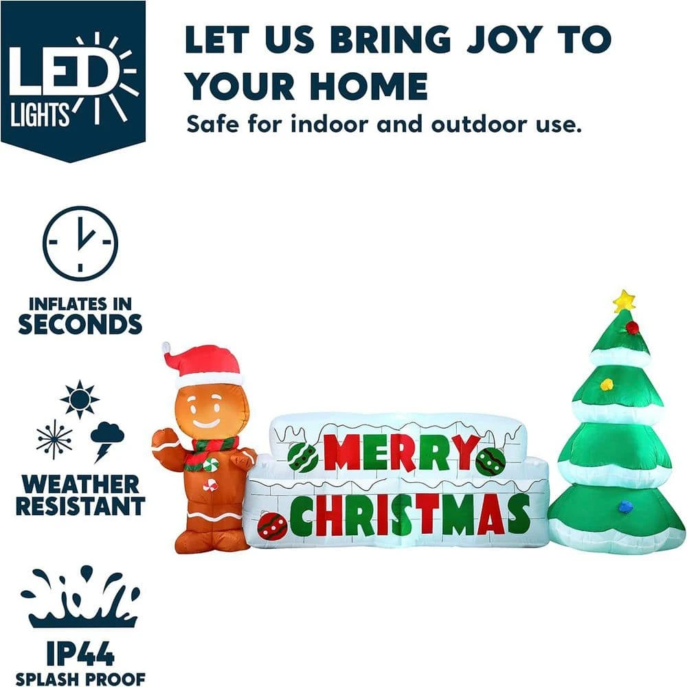 Joyfy’s 11 in. Inflatable Merry Christmas with Tree and Gingerbread Man is built with LED swirling lights. Secure it tight with the built-in sandbags and stakes that come with it. The perfect addition for your holiday-filled lawn and for the community to enjoy.
