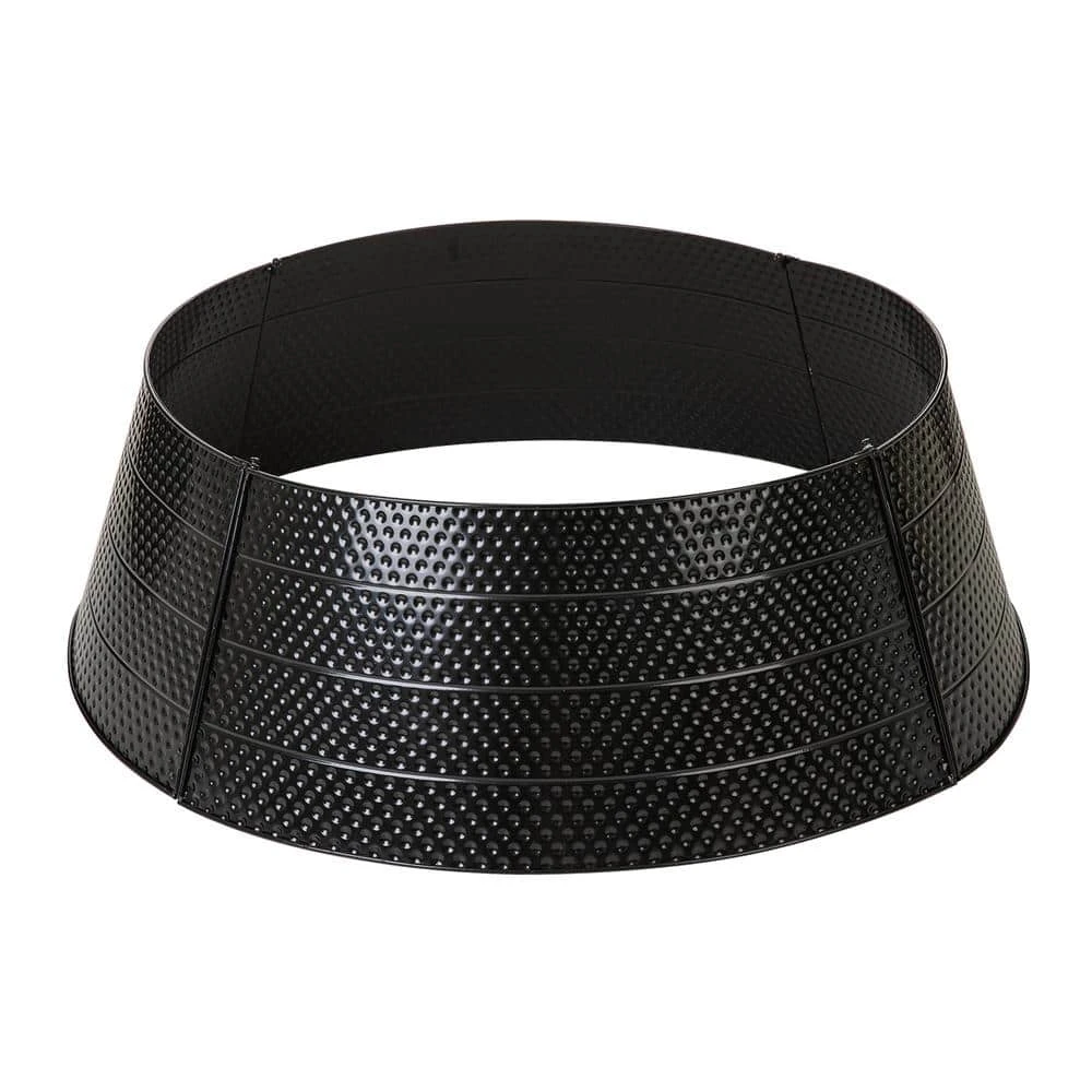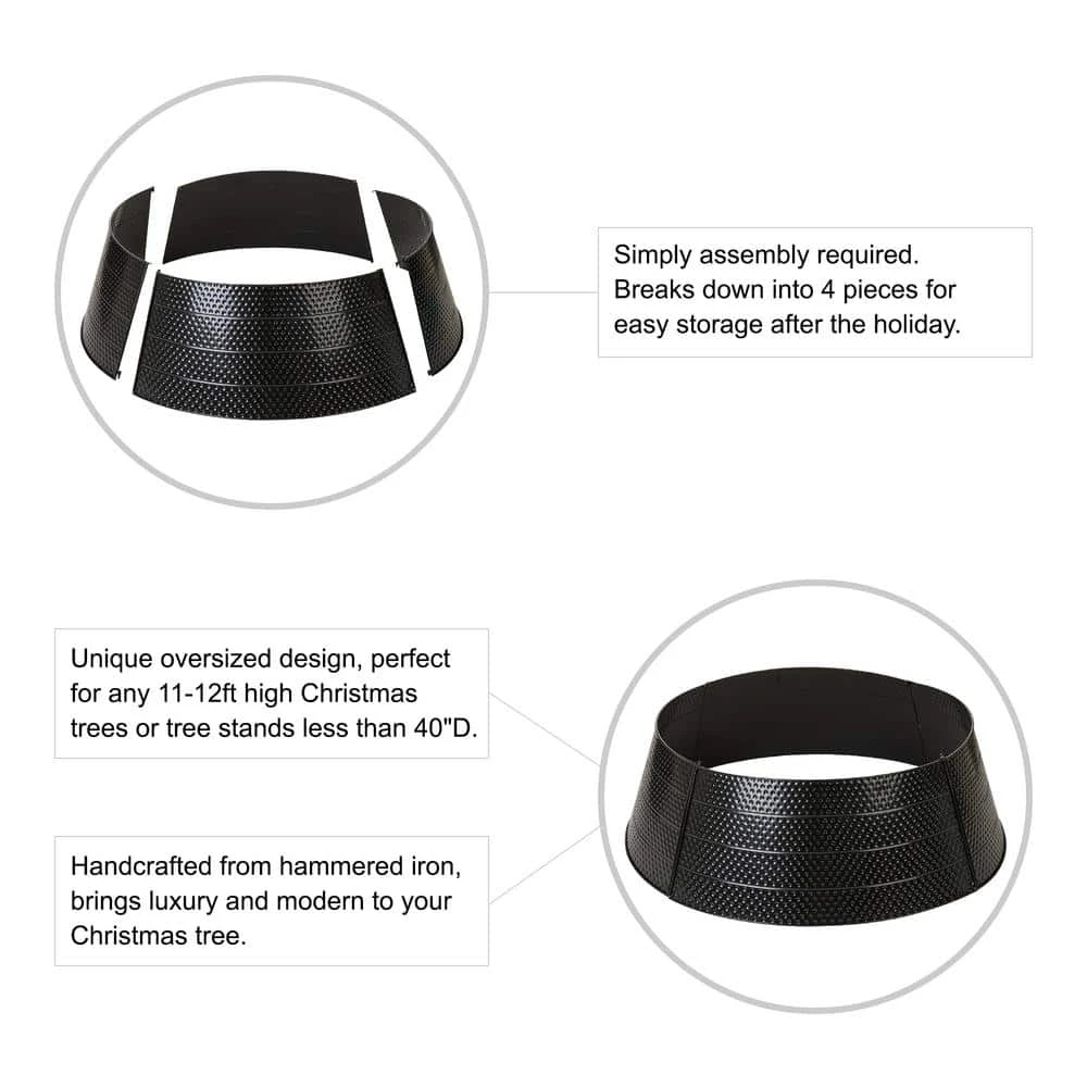 Create a unique look for your Christmas tree this year with this Black Hammer-harden Tree Collar. This unique collar showcases a brilliant textured finish and gives the tree a fashion look while maintaining the holiday spirit. Metal tree ring comes in 4 pieces. It is easy to assemble and disassemble, assembly hardware included.4-Sided Ring allows for easy access to the back of the tree.