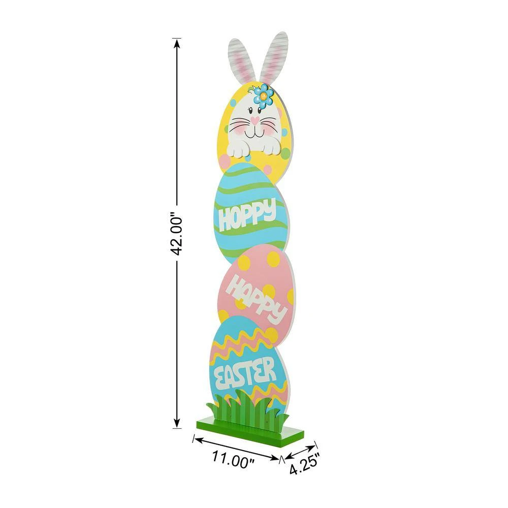 The adorable Easter Bunny porch sign features a stack of vibrant Easter eggs adorned with