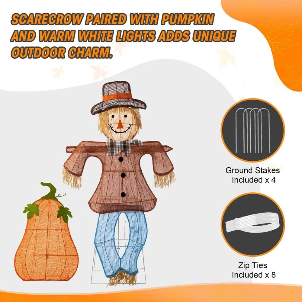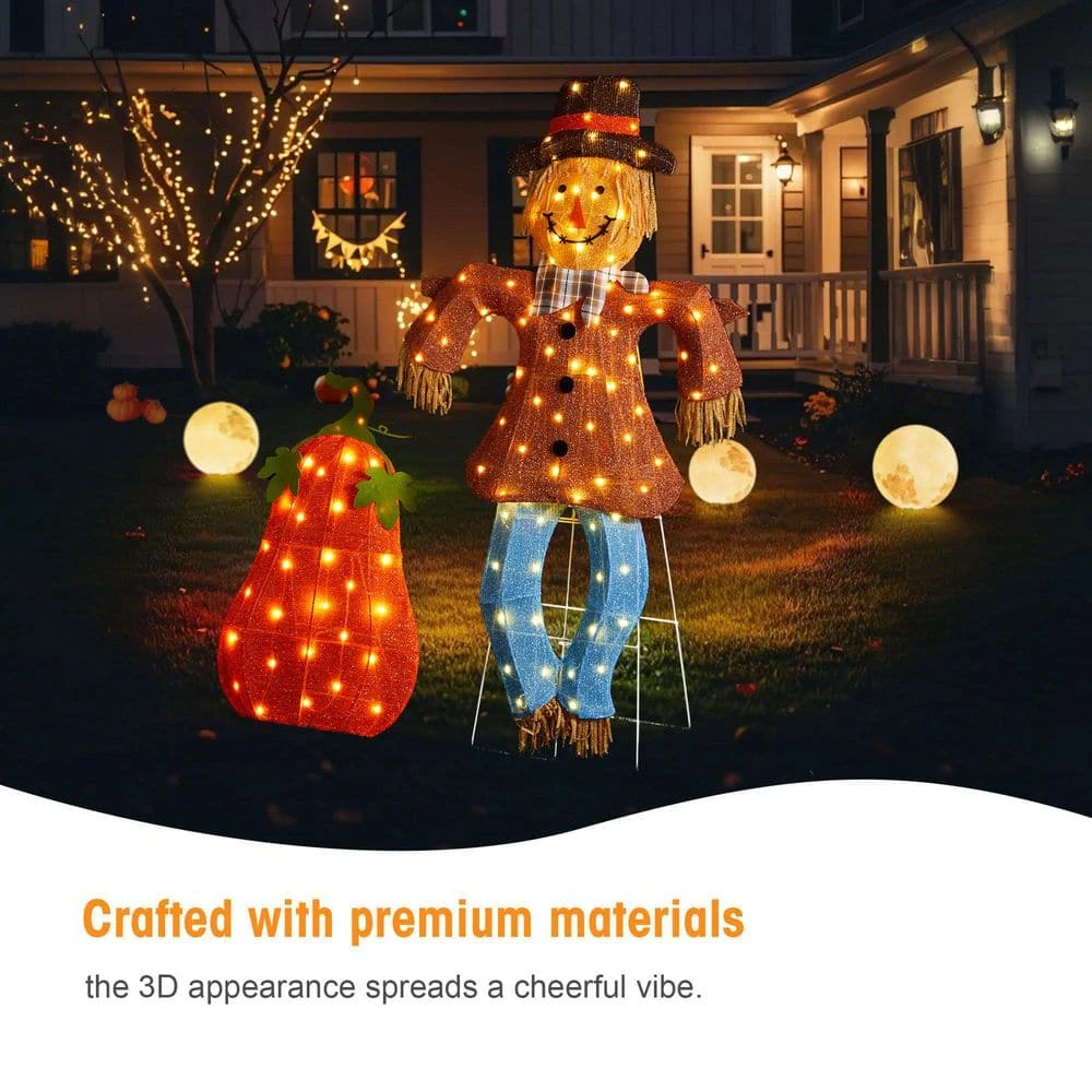 - Adorned with 80 white LED lights on the scarecrow and 30 on the pumpkin