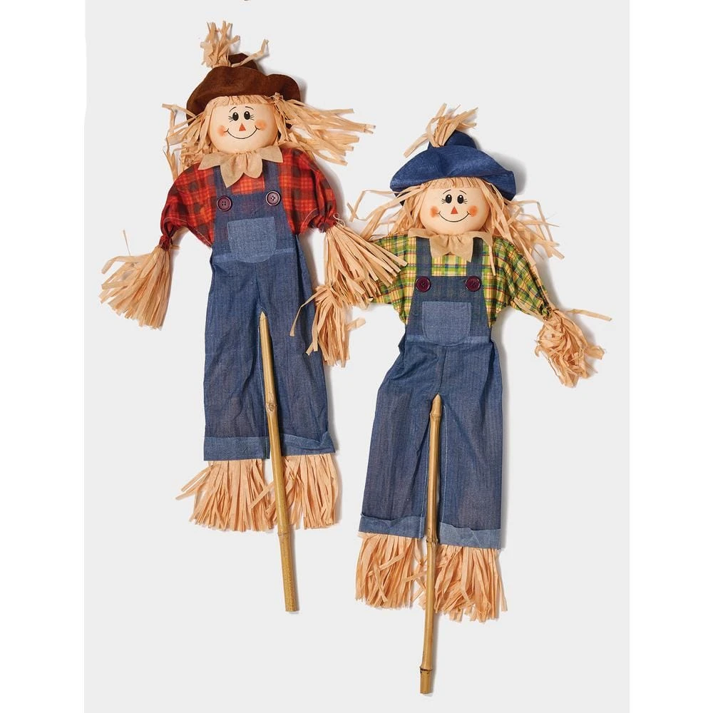 This great set of 2 scarecrows with overalls on a bamboo stick is the perfect fall decoration for your garden. It is made of fabric and straw for that special look. The set includes the boy and the girl ready to be displayed.