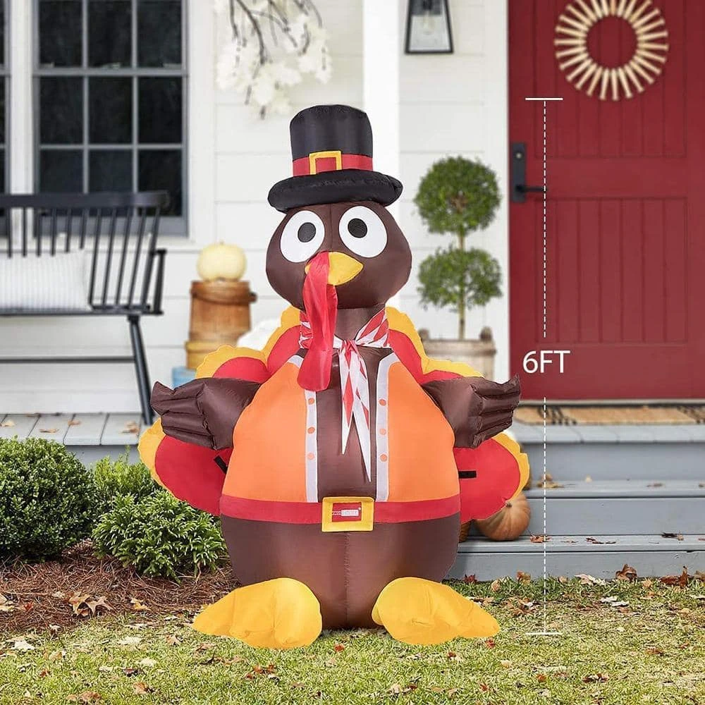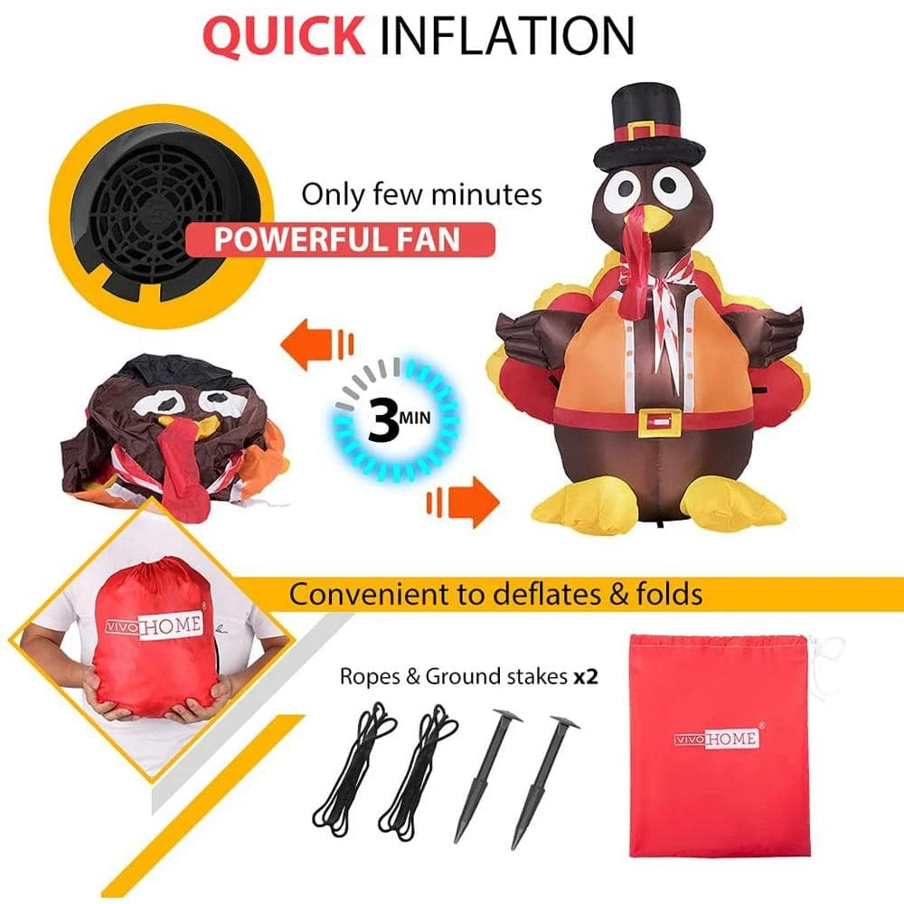This year, give a surprise at your Thanksgiving party. Use this VIVOHOME holiday inflatable decoration to bring the turkey off your plate and into your lives. The vivid, exciting, photogenic figure will excite everyone around your neighborhood. This big bird is easy to set up indoors and outdoors with a self-inflating fan. With multicolored LED lights, it will keep up the excitement, no matter day or night.
