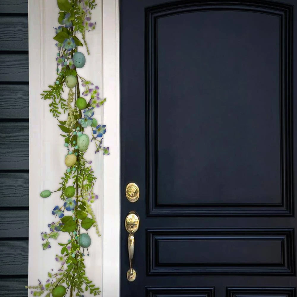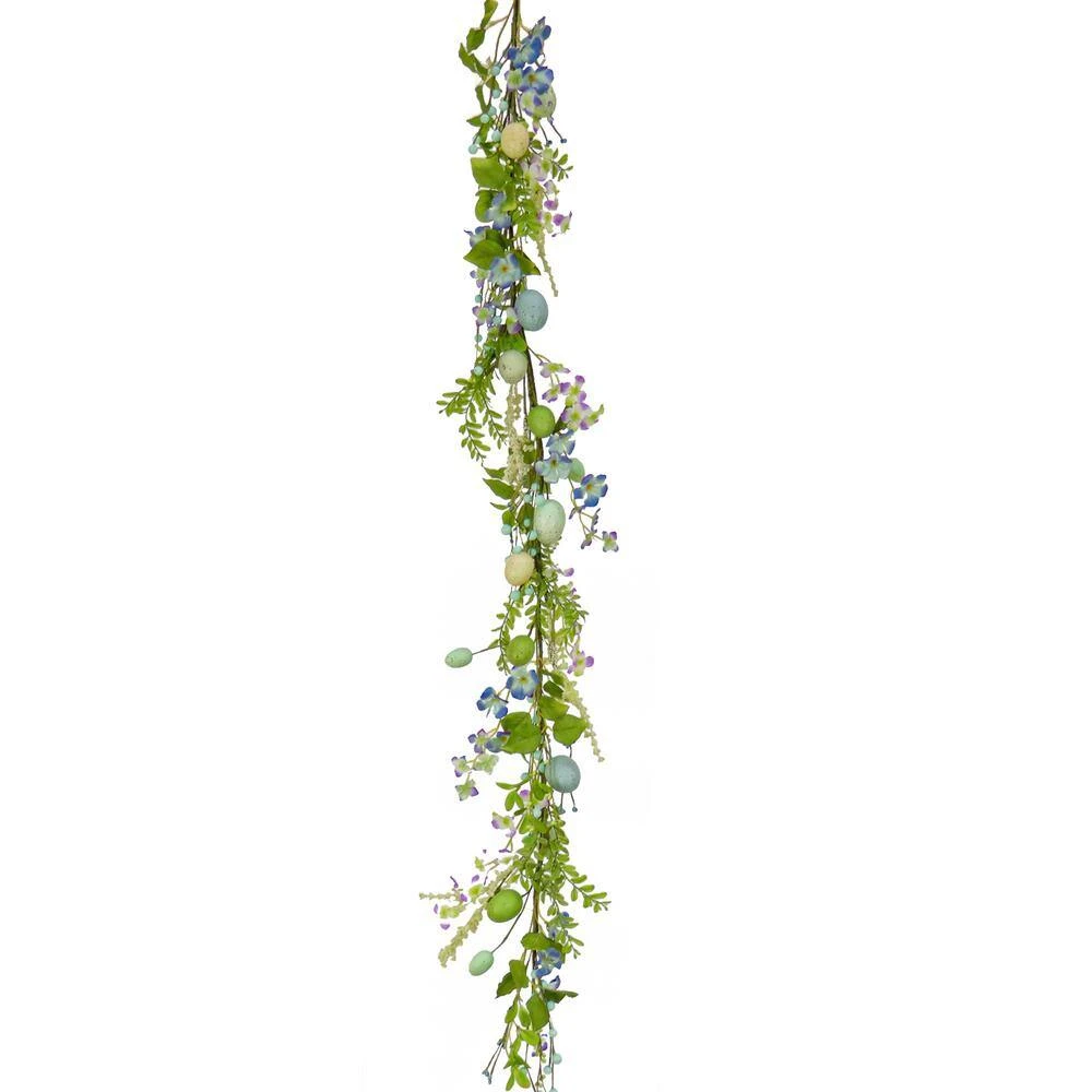 A soothing blue palette dominates this garland featuring pastel-colored eggs on a long flexible vine trimmed with miniature flowers, leafy greens, branch sprigs and berry clusters. Welcome Easter and the spring season with this bright and cheery decoration. Display this colorful garland over doors, windows, fireplace mantels or stairway railings, in indoor or covered outdoor locations.