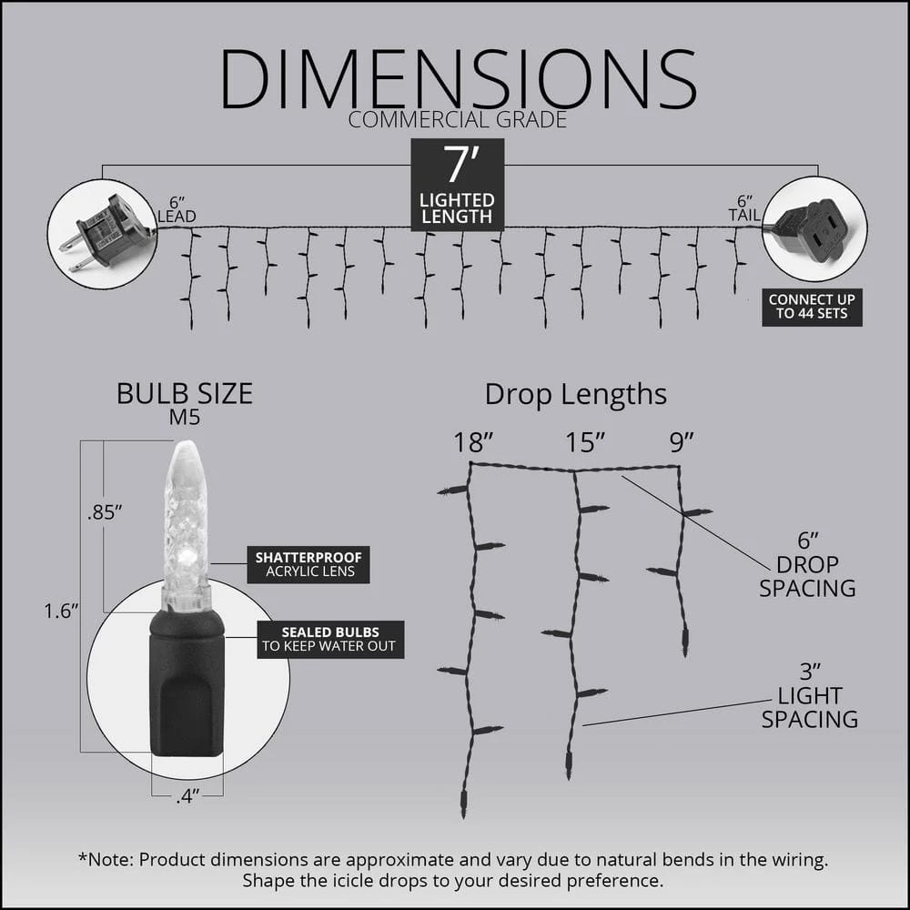 Beautiful, energy efficient, long-lasting and shatter-resistant, these M5 LED icicle light sets from Wintergreen Lighting make the perfect lights for any decorating need. The M5 bulb is the classic Christmas mini light bulb shape, with a faceted surface that refracts the light for dazzling effects. It’s made of acrylic so it’s virtually unbreakable, and it’s LED diode boasts an average lifespan of 100,000-hours. At only 4.83 Watts per set, these icicle lights are energy efficient too. But these lights feature touches that make them as refined as they are durable, like staggered drop lengths for a more realistic look and tighter wire twists for less tangling and a more professional looking display. Whether it’s Christmas, a wedding, a party, or you just want gorgeous icicle lights hanging around, these are the lights that will beautify your life for years to come.