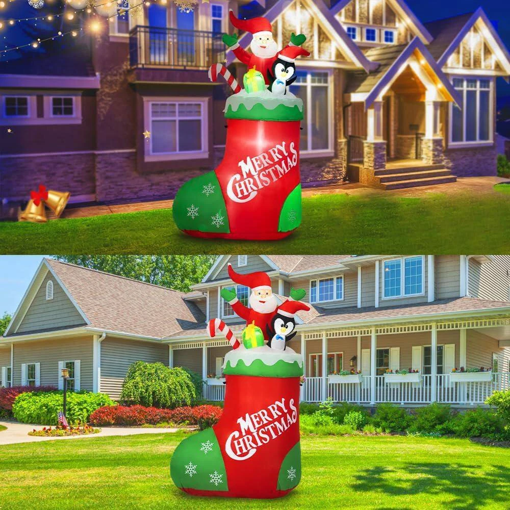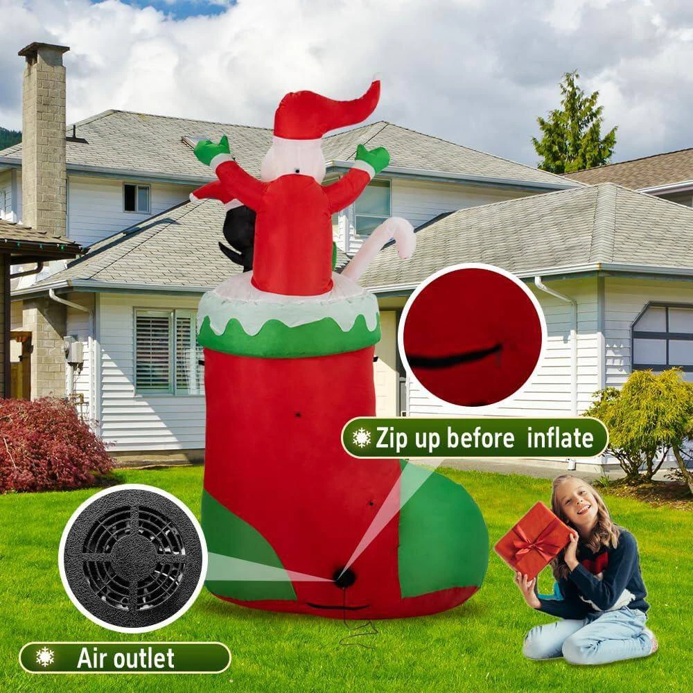 Add a touch of holiday magic with our 7 ft. Christmas Inflatable Socks with Santa, Santa Claus surprises everyone by popping out from a vibrant Christmas sock, creating an unforgettable festive atmosphere. This blow-up decoration inflates effortlessly with a powerful built-in blower and stays securely in place with ropes, stakes, and sandbags. Made from durable, weather-resistant polyester, it’s perfect for outdoor use and compact storage. Whether placed in your yard, garden, or patio, this charming decoration brings warmth and excitement to all your holiday celebrations.