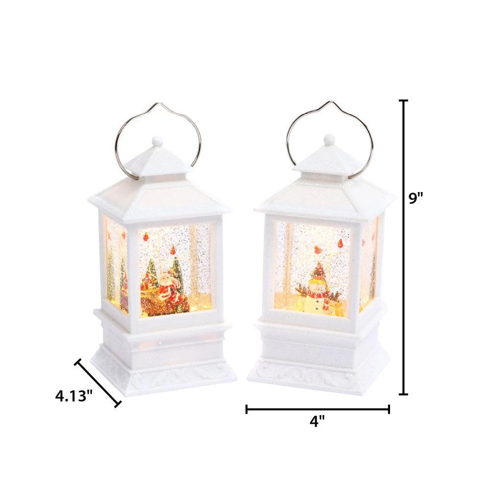 Delight while watching this set of 2 B/O lighted 8.75 in. H white lanterns with gently swirling glittering water around beautiful cardinals, trees and Christmas figures. 2 holiday styles, Santa and a snowman. Each featuring a 6-hour timer. Each lantern requires 3 AA batteries, not included.