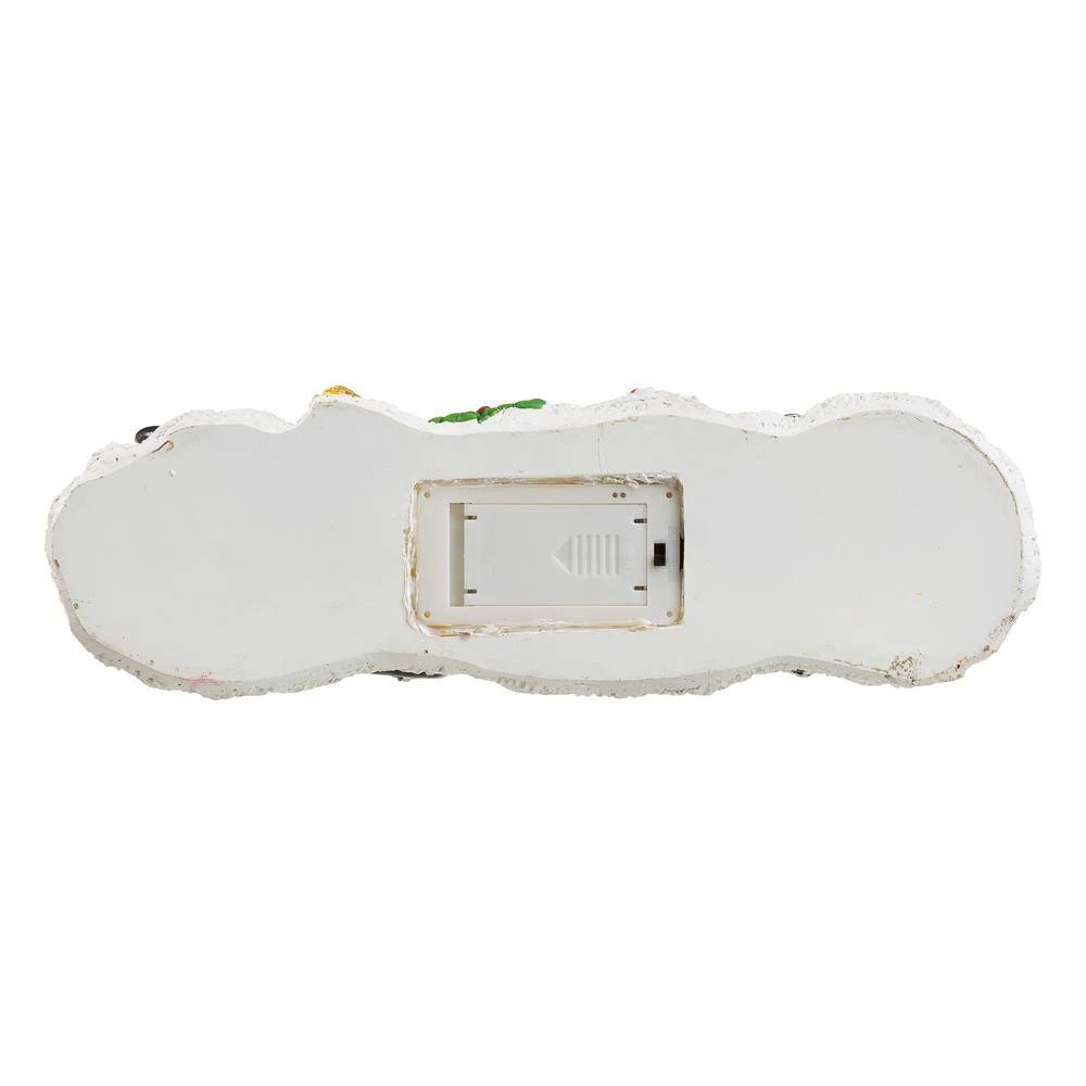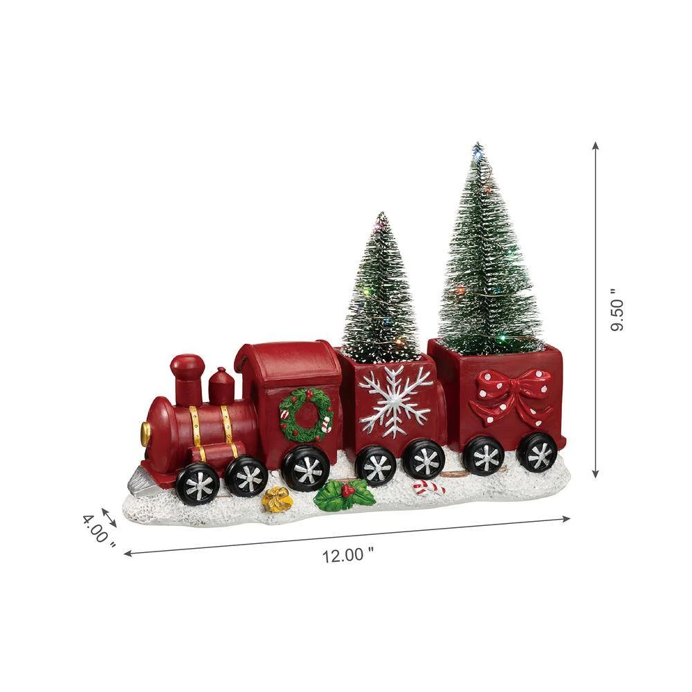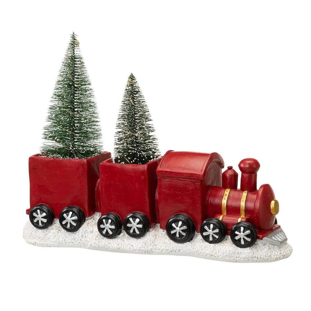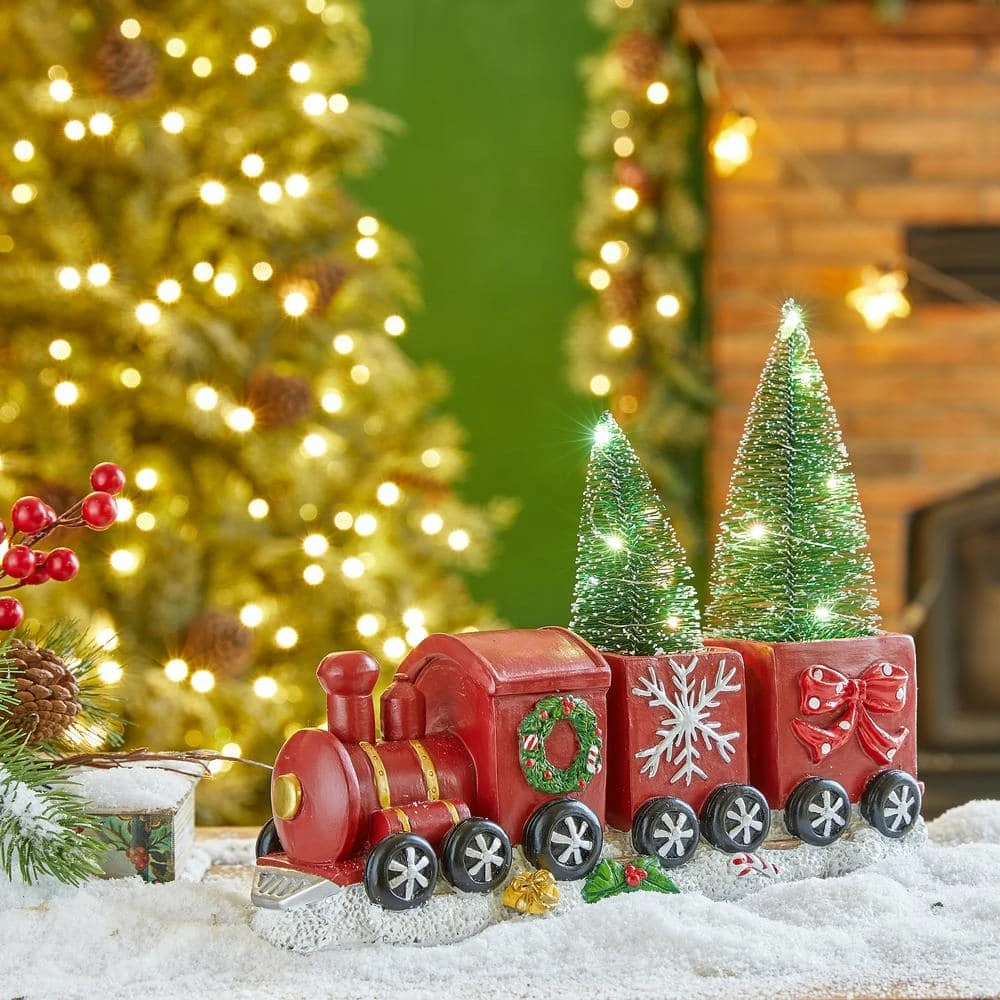 A unique Christmas train made of polyresin with decorated trees in the carriages and a nice wreath at the side. The locomotive and both carriages are in bright red and all are trimmed in green garland, snow and bowknot in turn. A string of battery powered white LED lights wrap around the trees adds soft illumination to your holiday.