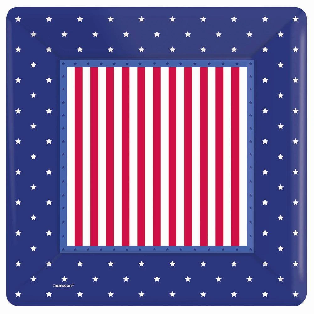 Show off your All-American spirit with our 10.5 in. x 10.5 in. American Classic paper plates. These square plates feature a red and white striped center with a blue starry border. Paper plates make cleanup quick and easy, pick some up for your next event.