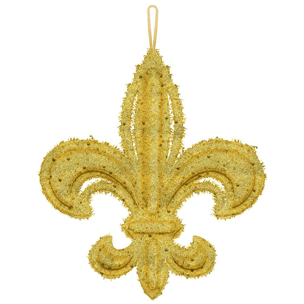 Get your decorating game going with this large glittery Fleur de Lis. The detailed Fleur de Lis is covered in purple, gold, and green glitter and is sure to add a sparkle to your decor. Hang this on your wall and get ready to party all night long.