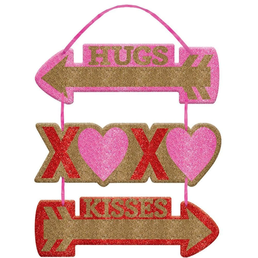 Cupid himself would stop short at this amusing, glittery Valentine’s Day arrow sign. Which way to go for love. 1-way for hugs, the other for kisses. This delightful glitter sign is just the thing you need to spice up any V-day party. 3-arrow signs, strung together with a sturdy ribbon hanger can be hung up anywhere you need a little whimsy.