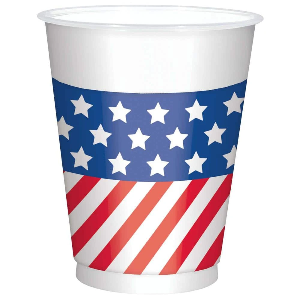 Cheers to America with these 16 oz. cups. These white plastic 16 oz. cups feature a red, white and blue pattern with stars and stripes. Sip your favorite beverages and celebrate, perfect for any Independence Day or political event.