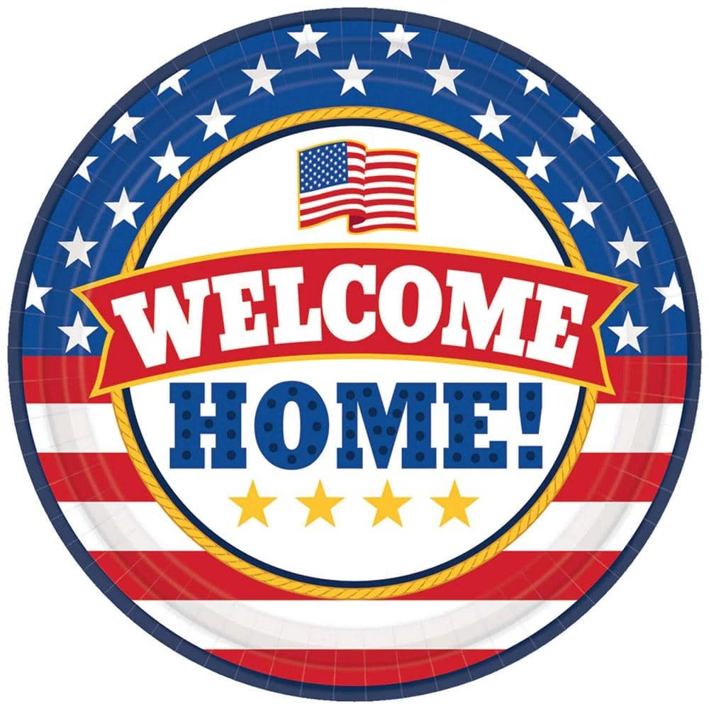 Welcome home your special guest with our Welcome Home 7 in. x 7 in. Welcome Home round paper plates. These plates feature a background of red, white, and blue stars and stripes with a