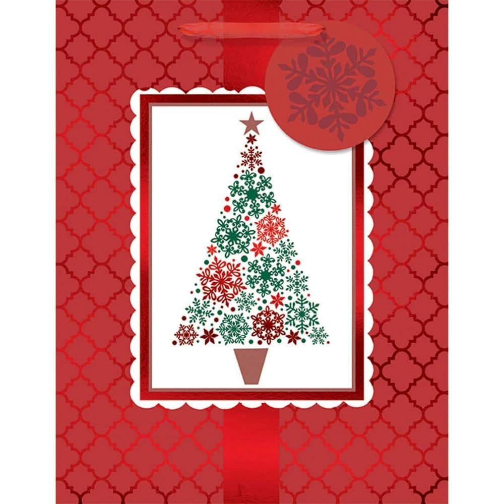 Christmas is a time for giving gifts to your loved ones. Dress up your presents with these Red and White Holiday Medium Vertical Bags with Gift Tags. Each shiny bag features a Christmas tree made of colorful snowflakes topped with a small star and a matching snowflake tag. Every bag has a handle to make carrying and gift giving easy.