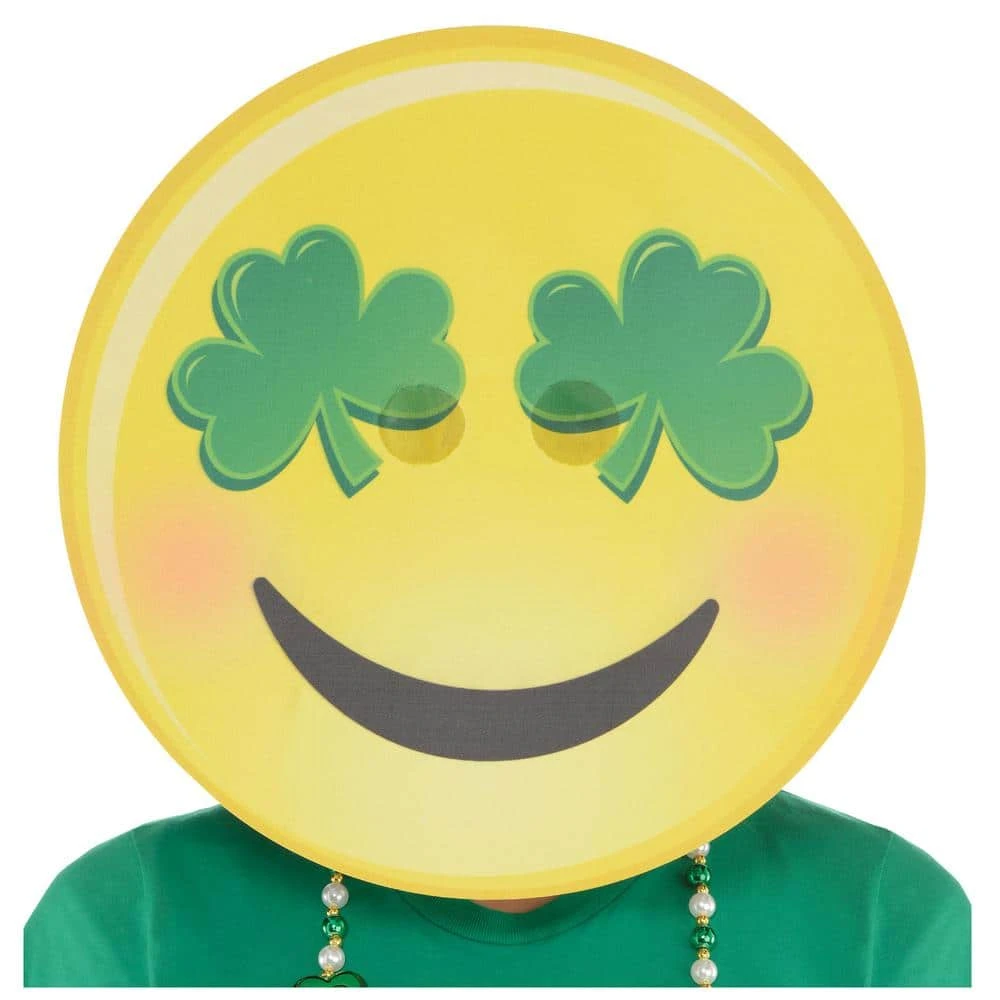 Look clover-eyed and rosy-cheeked when you don this St. Patrick’s Day Emoji Face Mask. This large foam mask sits comfortable over your head and features a smiling emoji with shamrocks for eyes, the fun Irish version of the heart-eyed emoji. With this mask you’re sure to turn some heads.