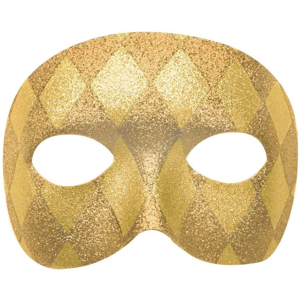 Glitter up your party when you slip on this harlequin Mardi grass glitter mask. Gold harlequin pattern really pops in glitter. Everyone loves a little harlequin during Mardi grass and with this mask you’ll be able to show off your true colors. Traditional half-face mask in harlequin diamond pattern in with multi-toned gold glitter just screams Mardi Gras Classic.