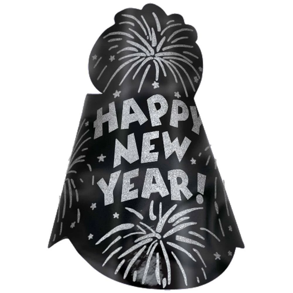 Say cheers to a new year with our Jet Black Glitter Foil New Year’s Cone Hats. Our Cone Hats feature a classic cone shape with a HAPPY NEW YEAR headline covered in glitter with tiny shooting stars. A white elastic band keeps this tight on your head. These glitter hats are perfect to set on the table for guests to grab for the final countdown.