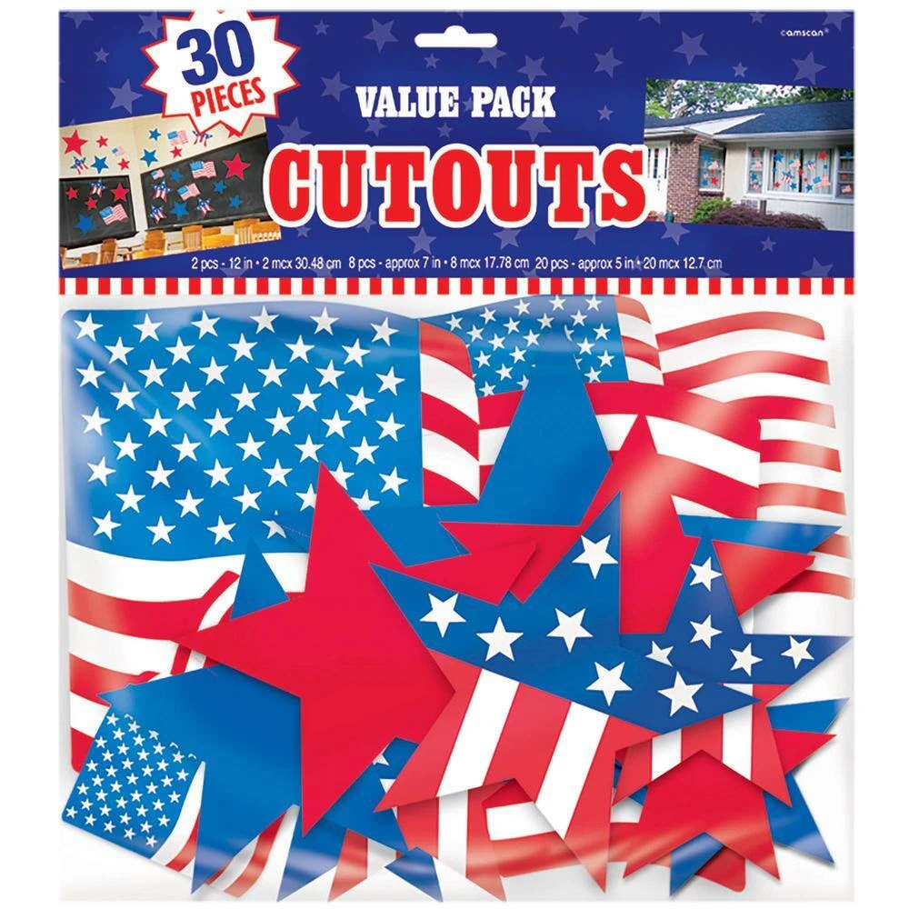 If you have a lot of space to decorate for your next Patriotic event, then this is a must have. This Patriotic cutout assortment features various printed paper cutout shapes. These cardstock cutouts vary in sizes from 5 in. to 10.5 in. and can be easily hung tape. There will be plenty to decoration your home, office or school.