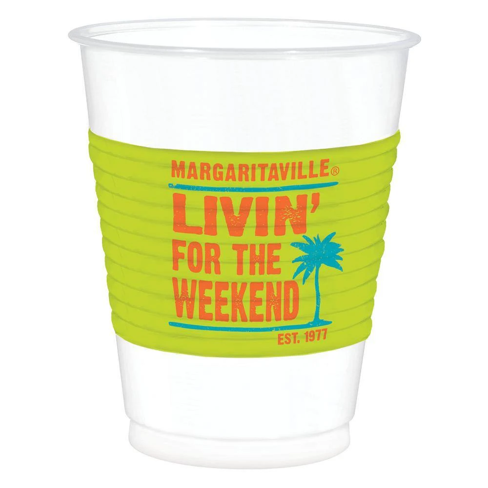 Your guests will want to stay here all season when you set your table with our Margaritaville Cups. Each white plastic cup features a green band with a Margaritaville. Living’ For The Weekend message across the side. Fill these cups with your favorite cold beverage and toast to a never ending summer.