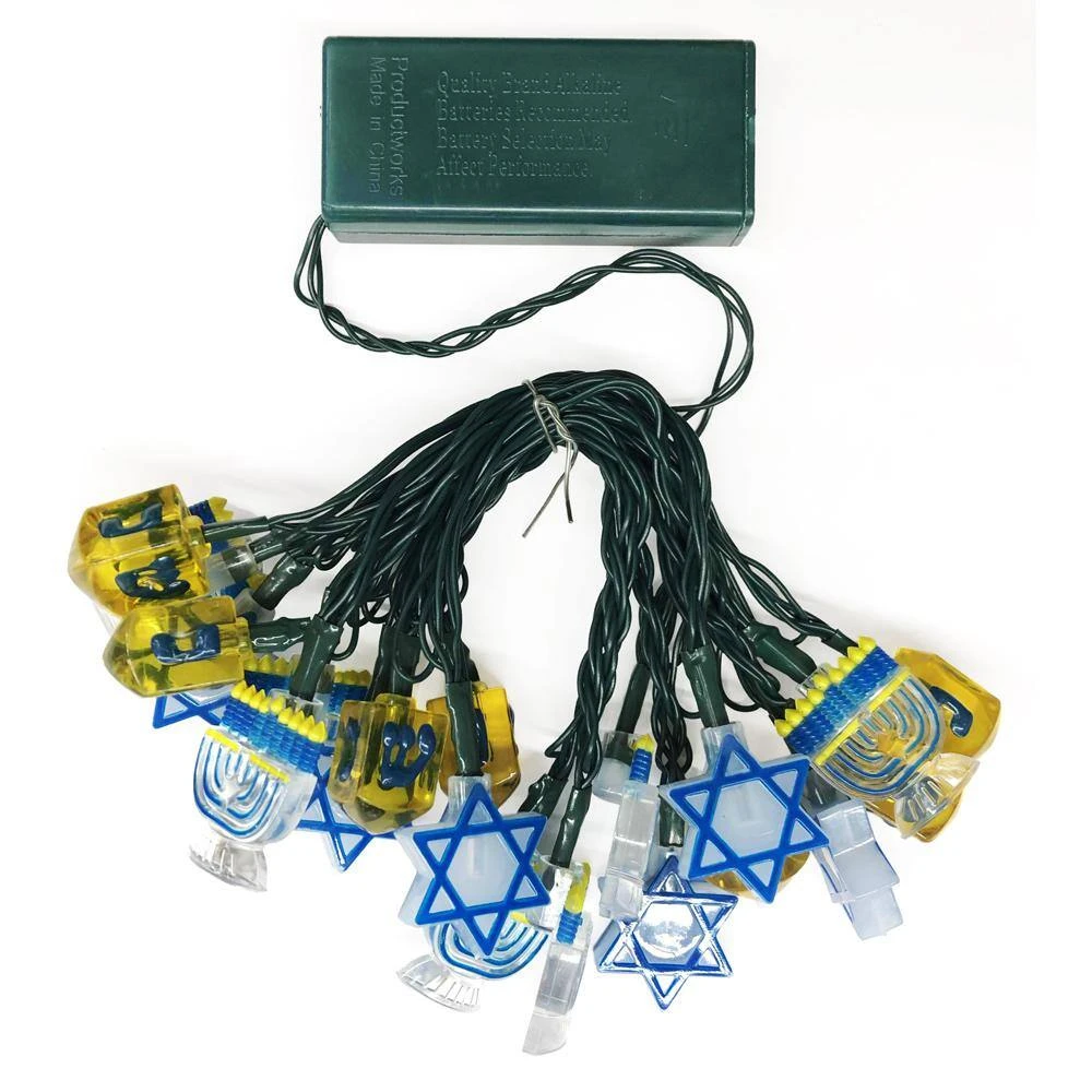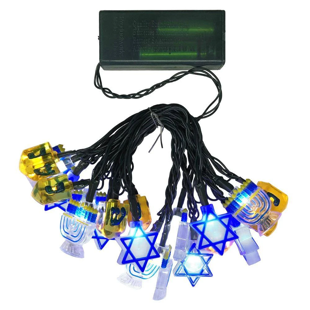 Decorate for Hanukkah with PRODUCTWORKS Ultra LED string lights with dreidels, menorahs, and Star of David icons. Features 20 ultra LED bulbs with the festive chanukah icons. This holiday light strand measures 97.5 in. long so you can decorate any space to your liking. Decorated with 20 lights in green, yellow and blue, this light strand will be sure to brighten any space with holiday cheer. Equipped with a steady on/off operation and includes a twinkle function. Measuring 97.5 in. long. These battery-operated lights are powered by 2 AA batteries (sold separately) and are intended for indoor use only.
