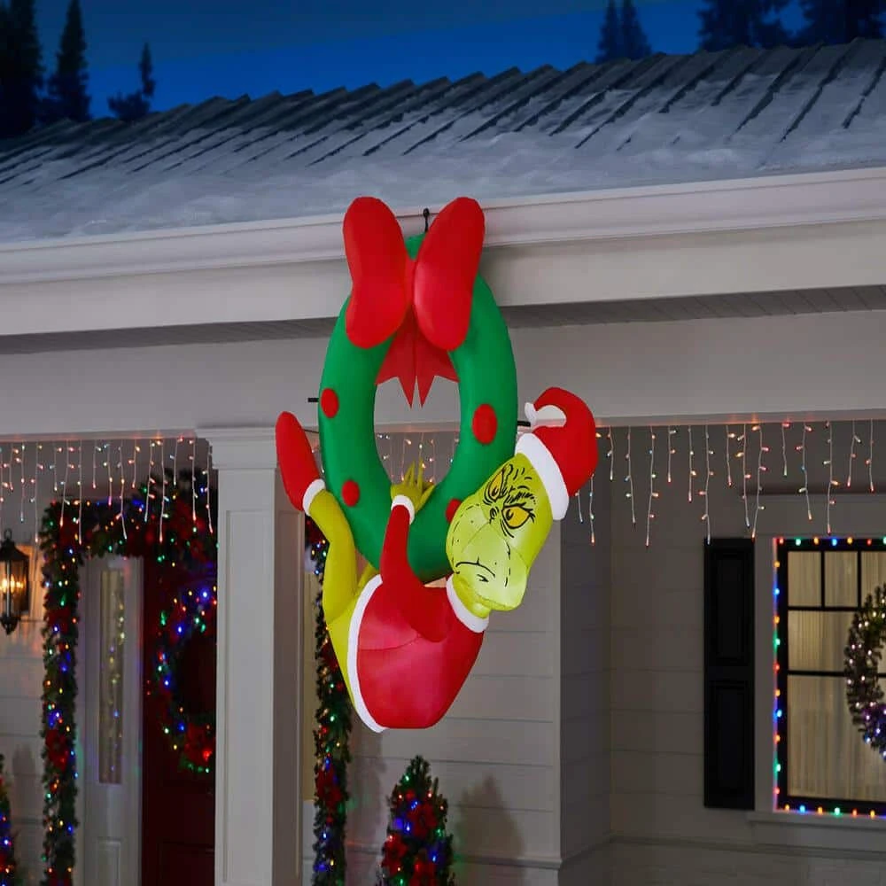 Evoke the magic of Christmas with this 4-foot Airblown Grinch inflatable. Hanging from a wreath and wearing a red and white outfit, this Grinch is poised to capture the attention of your guests. The multicolor design harmonizes with your decorative theme, and the energy-efficient LEDs provide bright illumination. This Airblown Grinch inflatable inflates easily and comes with tethers for quick setup and is made of sturdy polyester material for seasonal outdoor use.