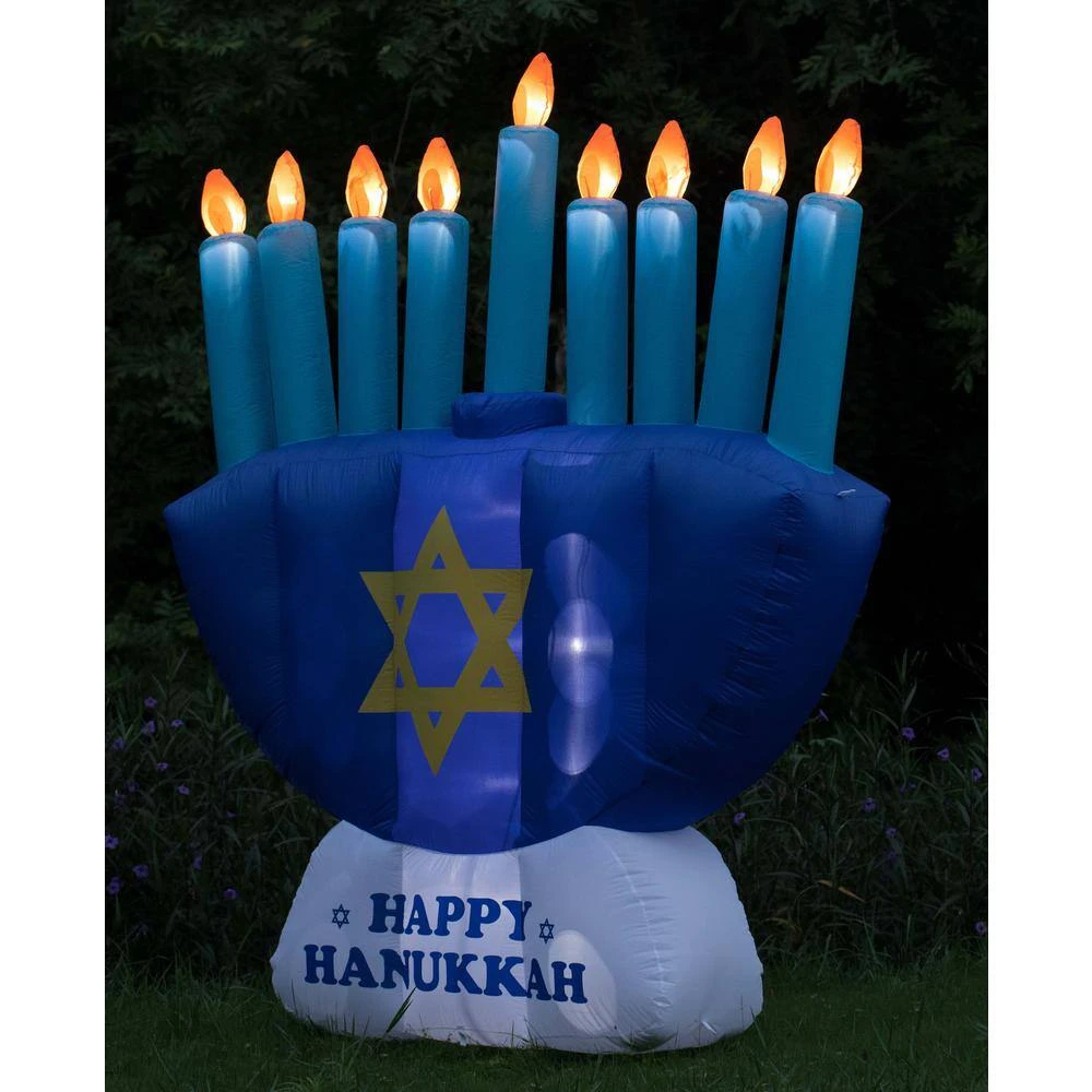 Brighten up your Hanukkah celebrations with this big inflatable menorah with built-in lights. This menorah is perfect to decorate your home, synagogue, yard or school. Comes with sand bag, plastic stakes, ropes, 13 LED bulbs to illuminate and a built-in fan motor to ensure fast and easy blow up. Menorah will get everyone into the holiday spirit.
