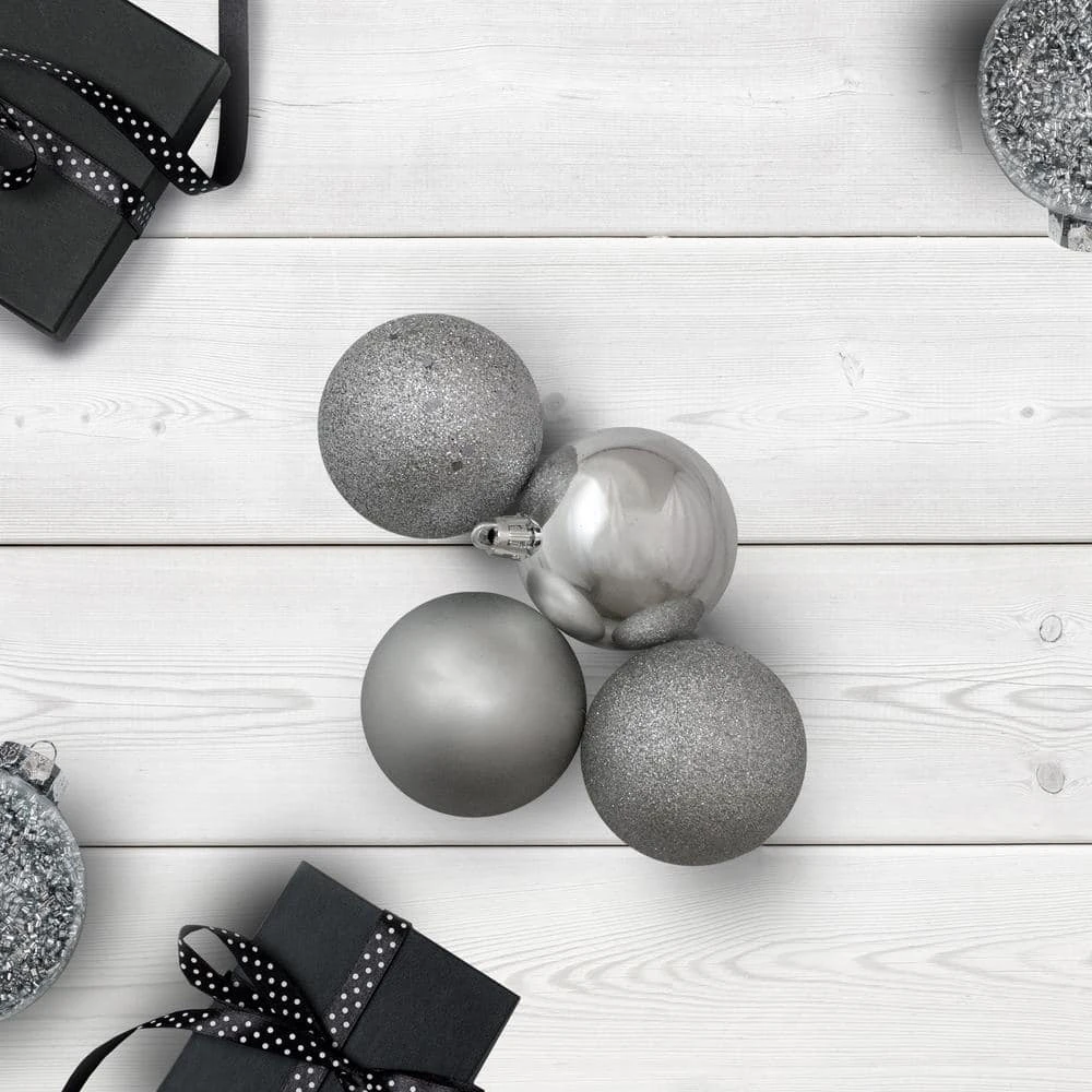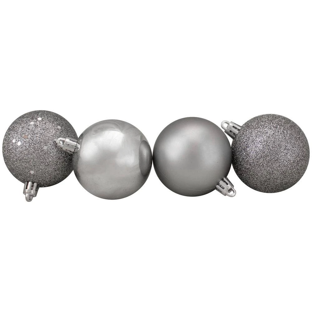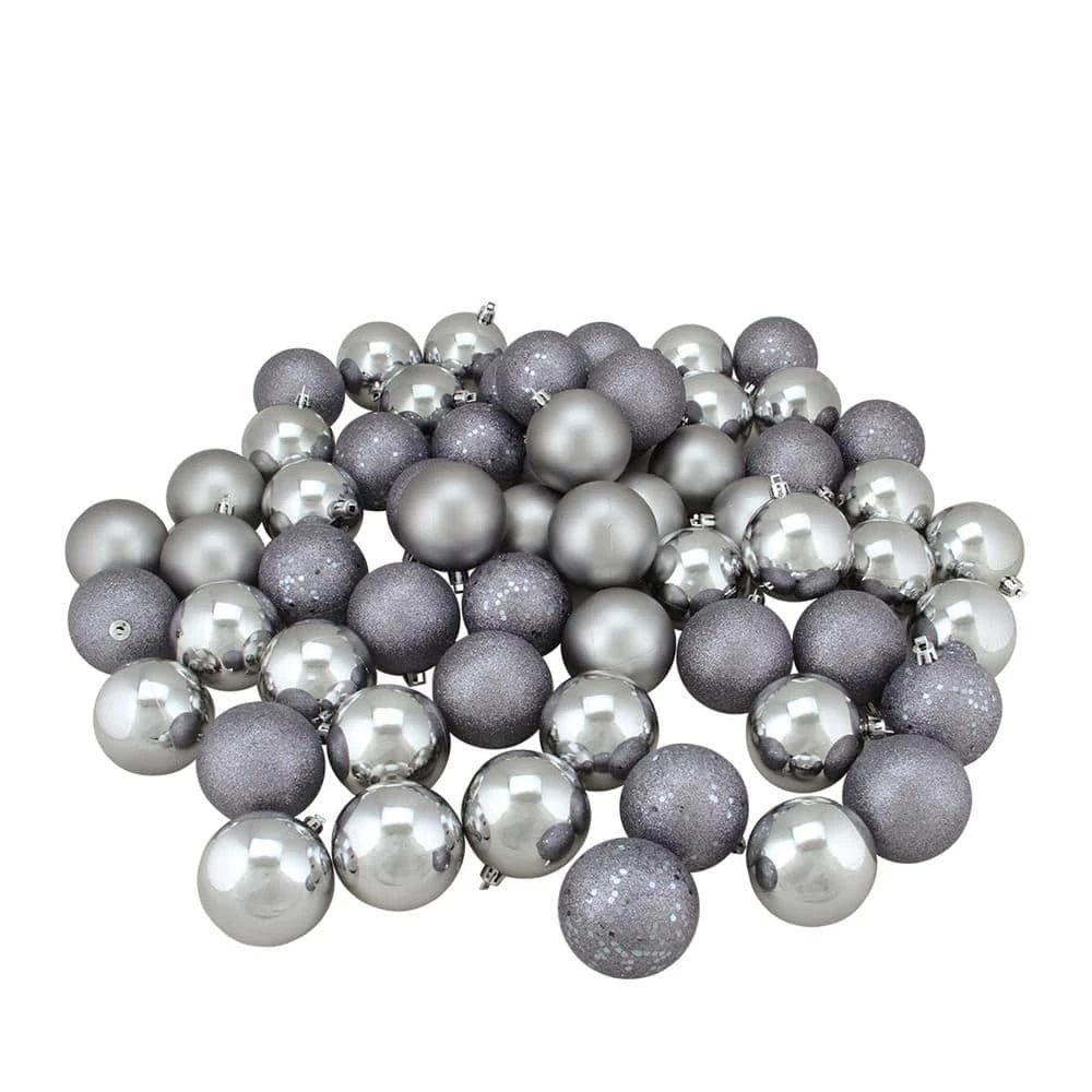 60-piece set. Color: pewter gray. These dazzling ornaments are done in 4 amazing finishes: shiny matte glitter drenched and holographic glitter sparkle. This special club pack will allow you to build your collection quickly and decorate with more possibilities. Shatterproof ornaments combine the beauty and luster of real glass with the unbreakable practicality of plastic. Balls are equipped with silver ornament caps. Pack of matching silver string hangers are included for optional use (ornament hooks not included). Dimensions: 2.5 in. (60 mm) Dia. Material(s): plastic/glitter.