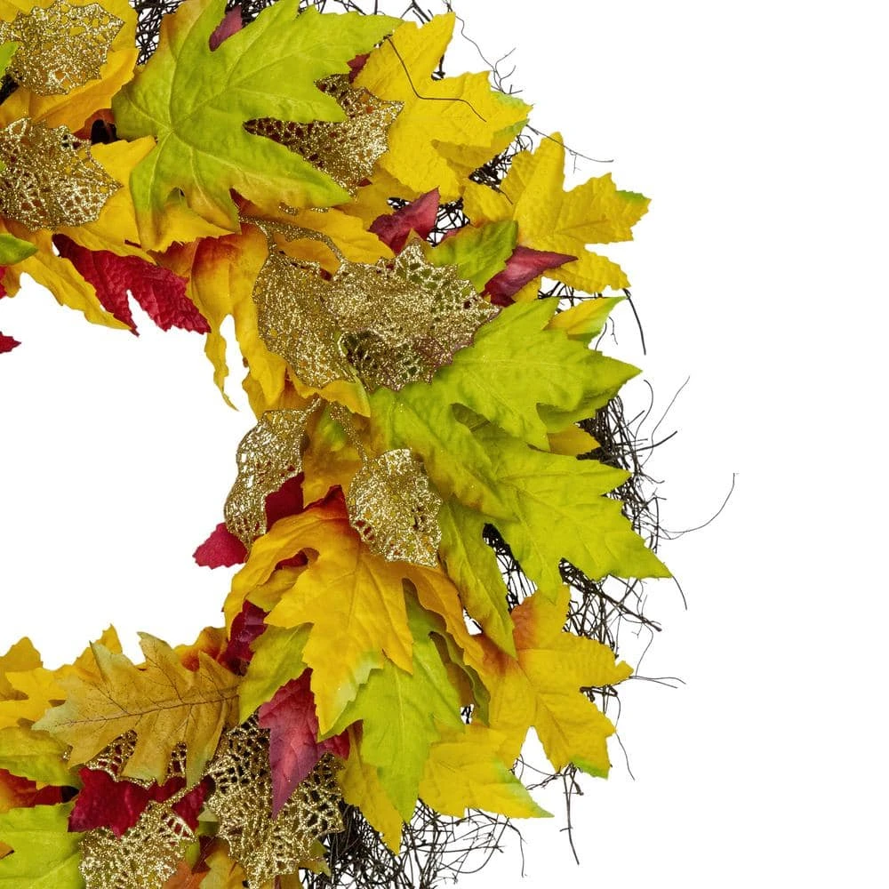 Take home this lush wreath bursting with rich-hued maple leaves. It comes with glitter leaves throughout and is perfect for all seasons. The foliage rests atop a natural grapevine twig base for easy hanging and never fails to bring in the Autumn time touch. Product Features: Fall foliage artificial wreath. Accented with rich orange burgundy red and green maple leaves with gold glitter leaves throughout. No assembly required – wreath comes in 1-piece. Recommended for indoor use or outdoor covered use. Perfect on your front door over the mantels on walls for all your decorating. Dimensions: 22 in. Dia (measured from outermost edge to outermost edge across the wreath). Material(s): grapevine/plastic/polyester.